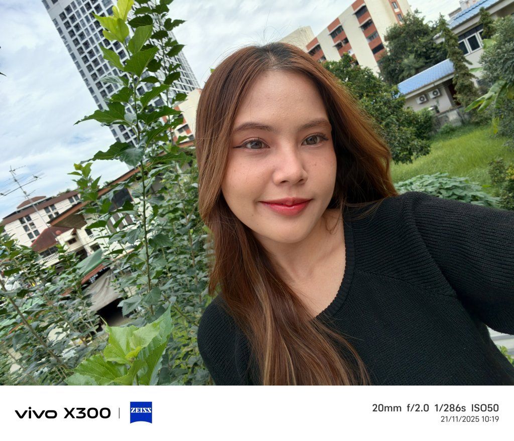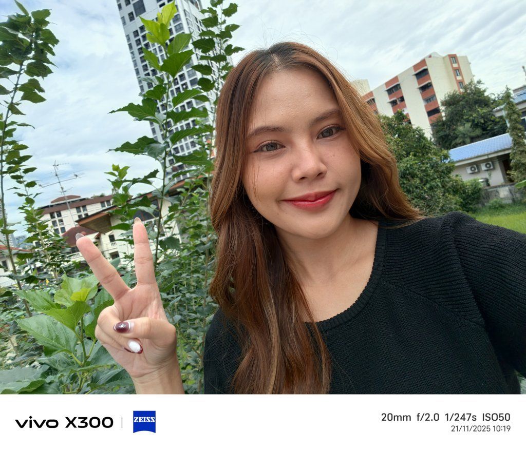 กล้องหน้าของ vivo X300 อัปเกรดแบบรู้สึกได้ทันทีด้วยเซนเซอร์ 50MP พร้อม Auto Focus ซึ่งช่วยให้ภาพคมกว่าเดิมมาก ไม่ว่าจะถ่ายใกล้หรือไกลก็โฟกัสหน้าได้แม่น ใบหน้าดูดีขึ้นโดยไม่เนียนเกินจริง สกินโทนทำออกมาพอดีและให้มิติที่ใกล้เคียงกับซีรีส์ V ที่ขึ้นชื่อเรื่องกล้องหน้าอยู่แล้ว