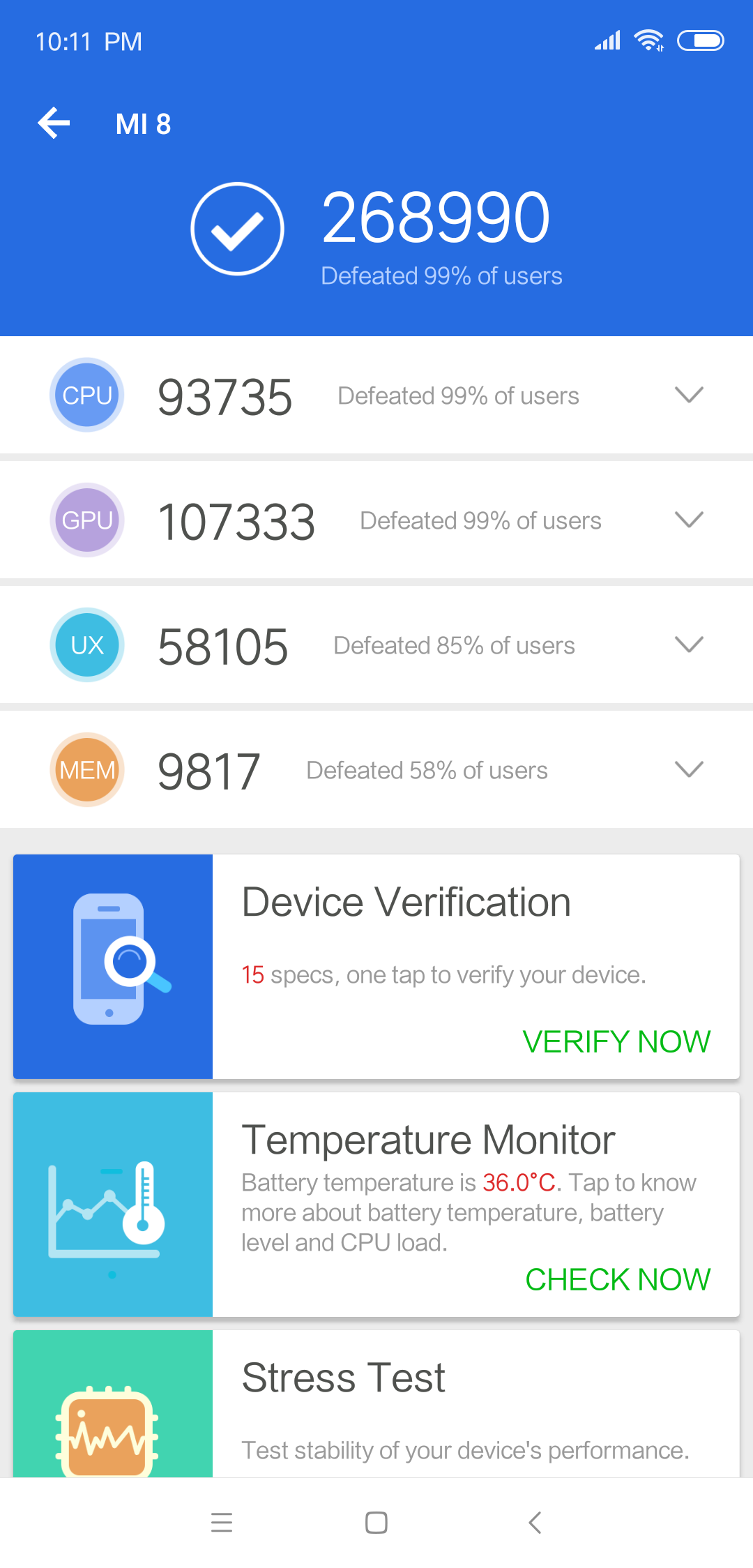 คะแนนของ Mi 8 นั้นไต่ขึ้นไปได้ระดับ 268,990 หรือประมาณ 270,000 ซึ่งความแรงก็ถือว่าดีกว่า Snapdragon 710 ใน Mi 8 SE ที่ได้ไปเพียง 168,919 คะแนน ซึ่ง ณ จุดนี้ยังรู้สึกว่าความแรงของ Snap 710 ดูจะยังไม่ได้แตกต่างจาก Snap 660 เท่าไหร่
