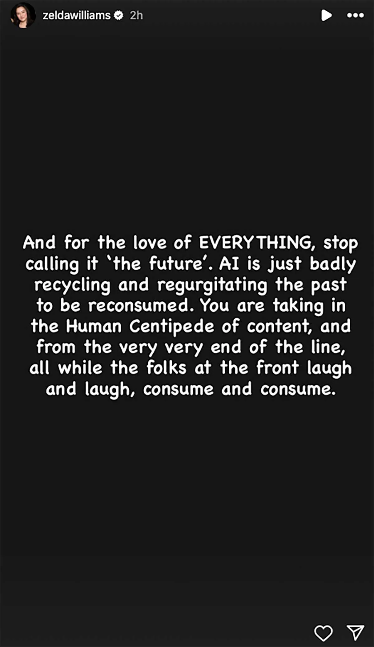 Zelda Williams กล่าวว่าวิดีโอหรือภาพ AI เหล่านั้นถูกมองโดยคนที่สร้างหรือ Prompt มันขึ้นมาว่าเป็นงานศิลปะชิ้นโบว์แดง ทั้งที่จริงแล้วมันเป็นเหมือนชิ้นเนื้อหรือฮอทดอกไร้คุณภาพที่ถูกทำขึ้นมาจากชีวิต และร่องรอยอันเลือนลางซึ่งถูกทิ้งเอาไว้โดยคนที่ได้จากไปแล้ว แถมตัวเธอในฐานะลูกสาวคนหนึ่งที่ต้องมาเห็นใบหน้าของพ่อถูกนำมาใช้พร่ำเพรื่อด้วย AI ก็ไม่ใช่เรื่องน่าดีใจสักเท่าไหร่