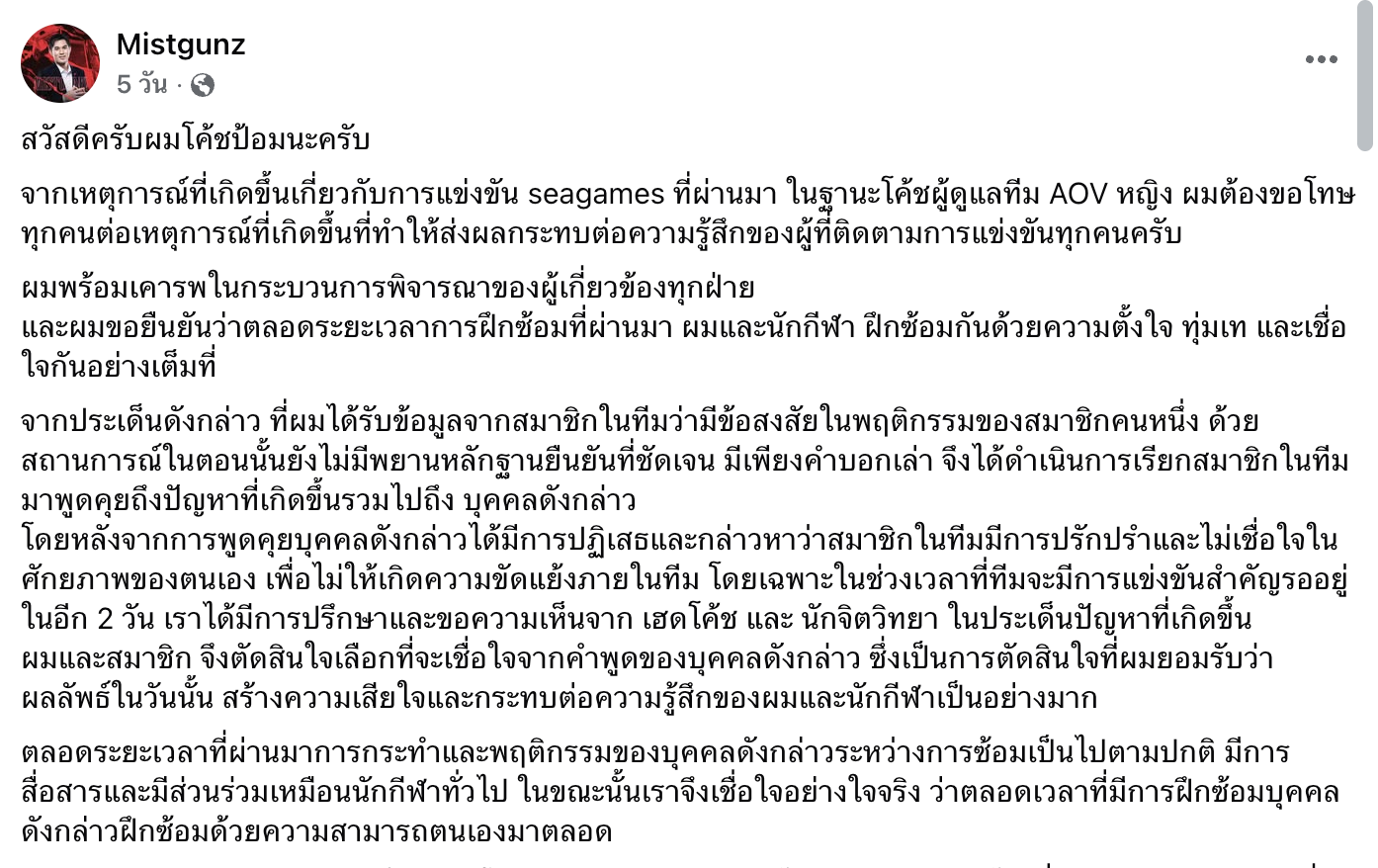 ในค่ำวันที่ 16 ธันวาคม 2025 เวลา 21.11 น. “โค้ชป้อม” หรือโค้ชผู้ดูแลทีม AOV หญิง ได้ออกมาเคลื่อนไหวผ่าน Facebook ของตนเองเพื่อชี้แจงกรณีต่าง ๆ และความเป็นมาของสิ่งที่จะเกิดขึ้นก่อนการแข่งขันว่ามีอะไรได้เกิดขึ้นบ้าง พร้อมกับลงท้ายโพสต์ด้วยใจความว่า “ตลอดระยะเวลาที่ผ่านมา การกระทำและพฤติกรรมของนักกีฬาหญิงคนดังกล่าวในระหว่างการซ้อมเป็นไปตามปกติ จึงทำให้เชื่อใจได้ว่าตลอดเวลาการฝึกซ้อม ตัวของนักกีฬาหญิงได้ฝึกซ้อมด้วยความสามารถของตนเองมาตลอด”