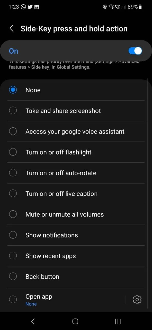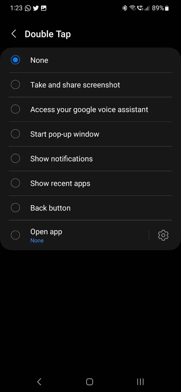 แต่ทีเด็ดของแอปที่จะพูดถึง คือการที่มันมีปุ่ม Back-Tap Action ที่เปิดโอกาสให้เราไปตั้งค่าว่าจะให้เคาะหลังมือถือแล้วสั่งการอะไรได้บ้าง เช่น แคปภาพหน้าจอ, เรียก Google Assistant, เปิดหน้าเป็น Pop-up, แสดงแถบแจ้งเตือน, แสดงแอปที่เพิ่งใช้, ย้อนกลับไปหน้าเดิม, หรือจะสั่งให้เปิดแอปโดยเฉพาะขึ้้นมาด้วยก็ได้
