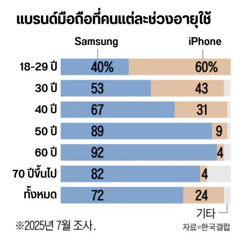 อ้าอิงจากผลสำรวจของ Gallup Korea เมื่อเดือนกรกฎาคม 2025 พบว่า iPhone ครองส่วนแบ่งตลาดในเกาหลีไปได้มากถึง 60% ในกลุ่มผู้ที่มีอายุ 18 – 29 ปี แซงหน้า Samsung Galaxy ที่ทำไปได้แค่ 40% ในขณะที่ส่วนแบ่งตลาดกลุ่มคนอายุ 30 ปีขึ้นไป Samsung Galaxy มีส่วนแบ่งอยู่ที่ 53% และ iPhone มีส่วนแบ่ง 43%