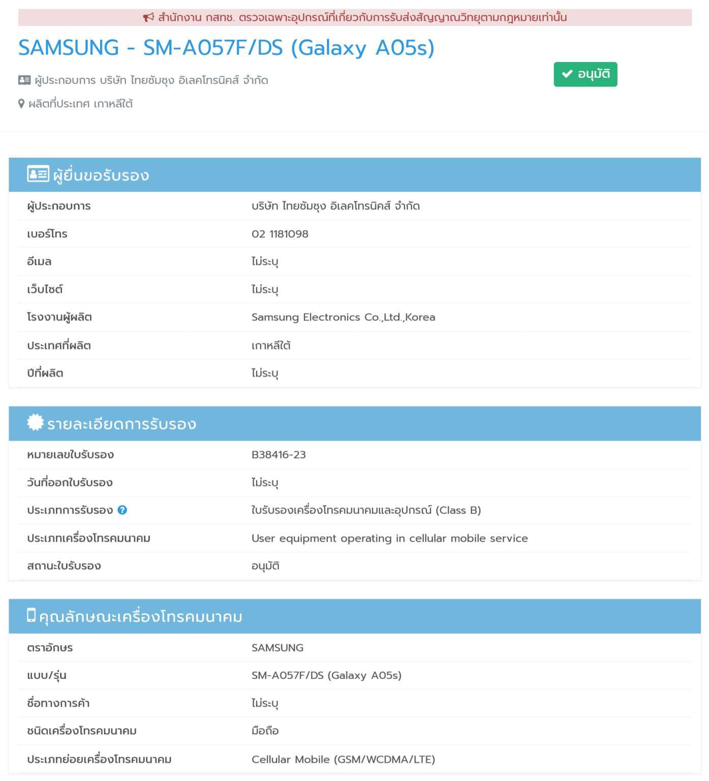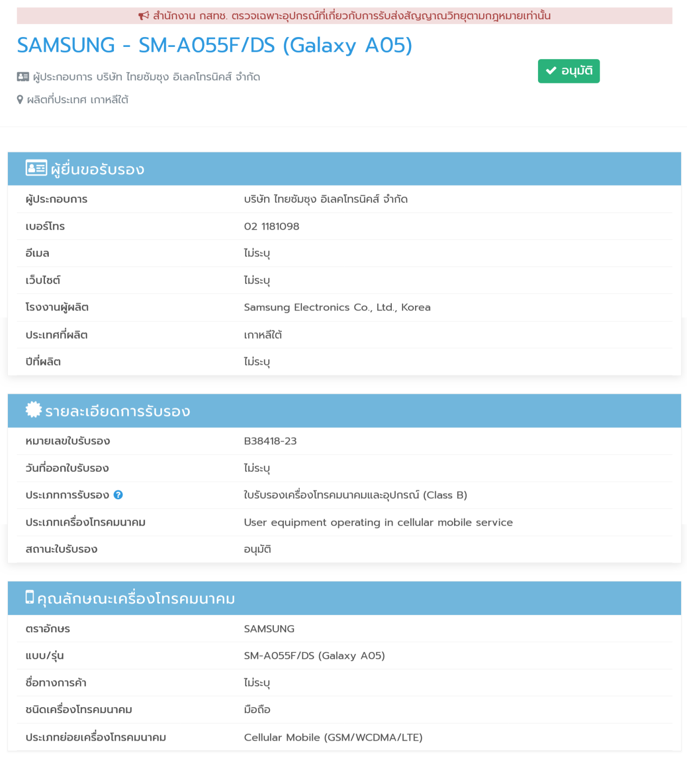 Samsung Galaxy A05, Galaxy A05s หลุดผลทดสอบบน Geekbench และ Bluetooth SIG พร้อมหมายเลขรุ่น SM-A055F และ SM-A057F ซึ่งทั้งสองรุ่นผ่านผ่านการรับรองจาก กสทช. ในไทยเป็นที่เรียบร้อยแล้ว