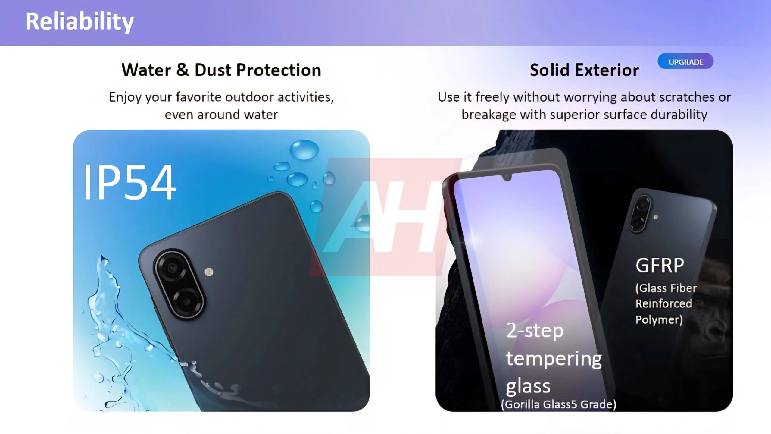กระจกหน้าจอนิรภัย 2 ชั้น ที่ให้คุณภาพเทียบเท่ากับ Corning Gorilla Glass 5 และฝาหลังทำจากวัสดุโพลีเมอร์เสริมใยแก้วเพื่อความทนทาน ตัวเครื่องมีน้ำหนักอยู่ที่ 199 กรัม และความหนาตัวเครื่อง 8.2 มม.
