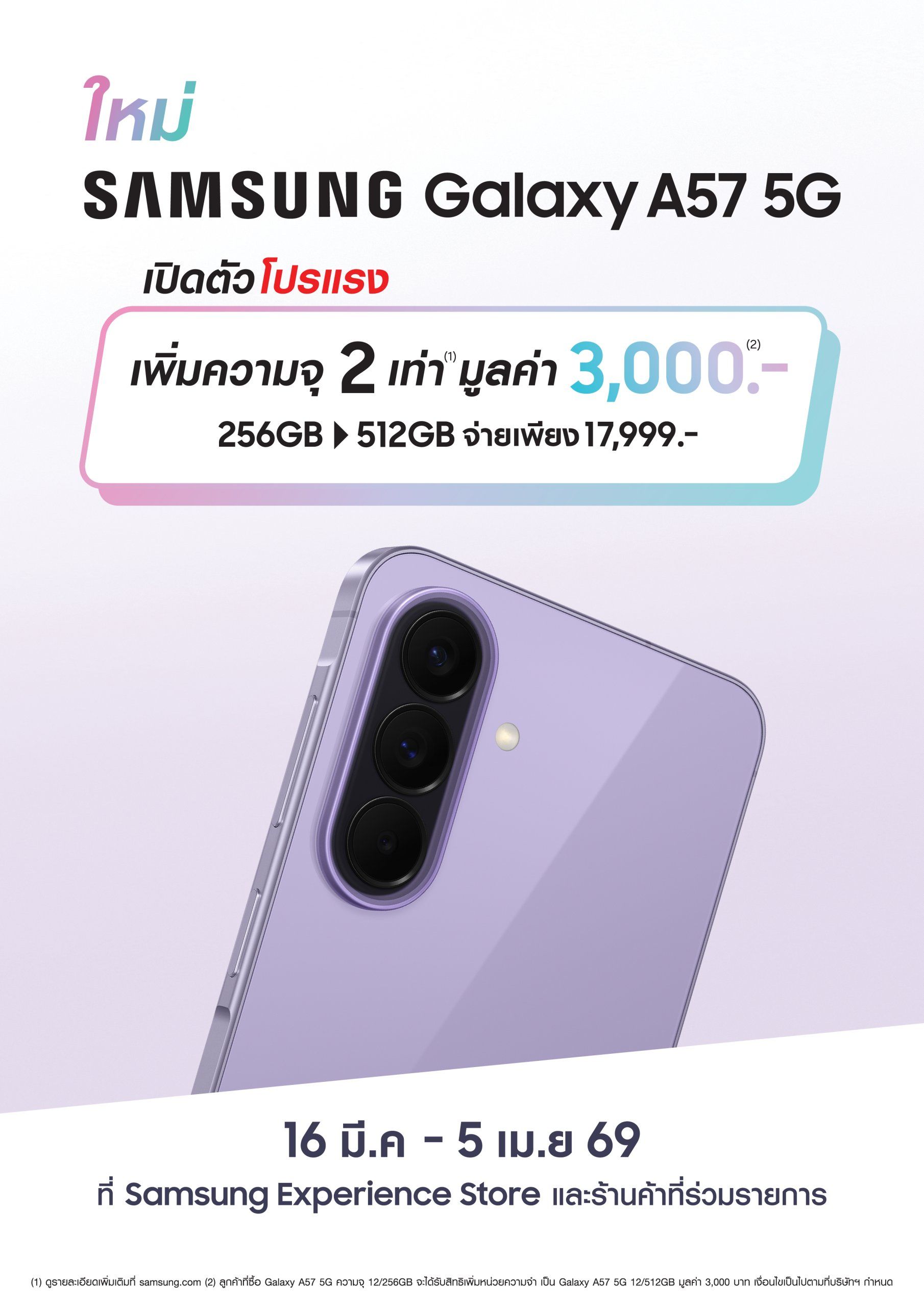 โปรโมชันช่วงเปิดตัวเท่านั้น Galaxy A57 5G อัปความจุเพิ่ม 2 เท่า จ่ายเพียง 17,999.- สำหรับความจุ 256GB ได้อัปเกรดเป็นความจุ 512GB ฟรีทันที (16 มี.ค. – 5 เม.ย. 69 เท่านั้น)