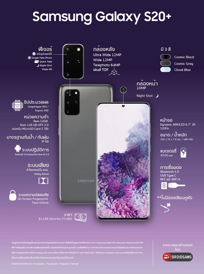 - Galaxy S20+ : ราคาเริ่มต้น 1,099 ดอลลาร์ ประมาณ 34,200 บาท