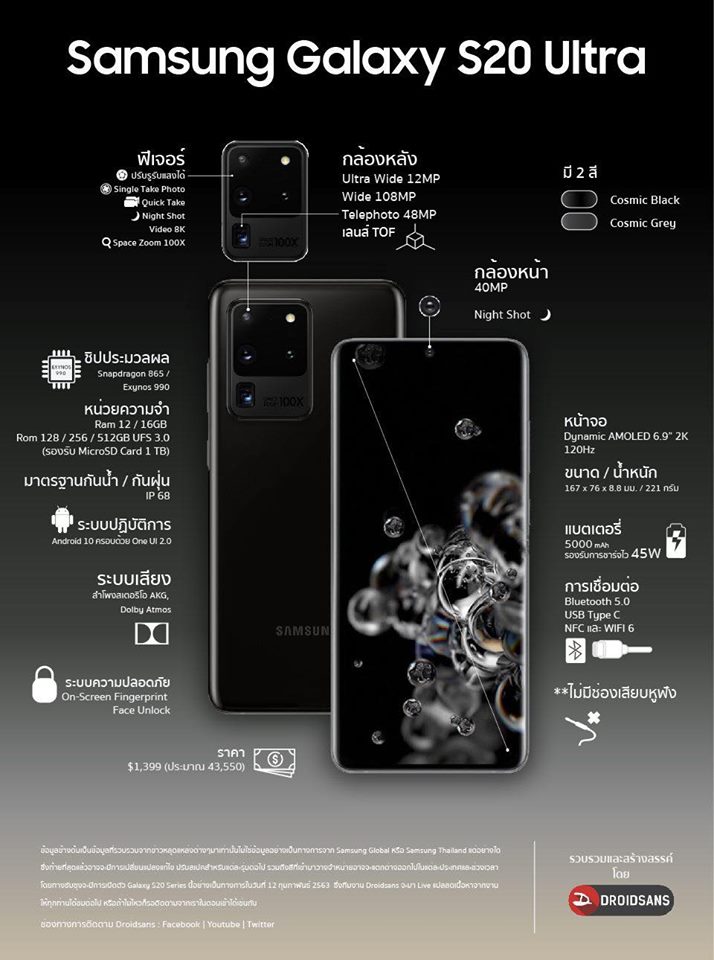 - Galaxy S20 Ultra : ราคาเริ่มต้น 1,399 ดอลลาร์ ประมาณ 43,550 บาท