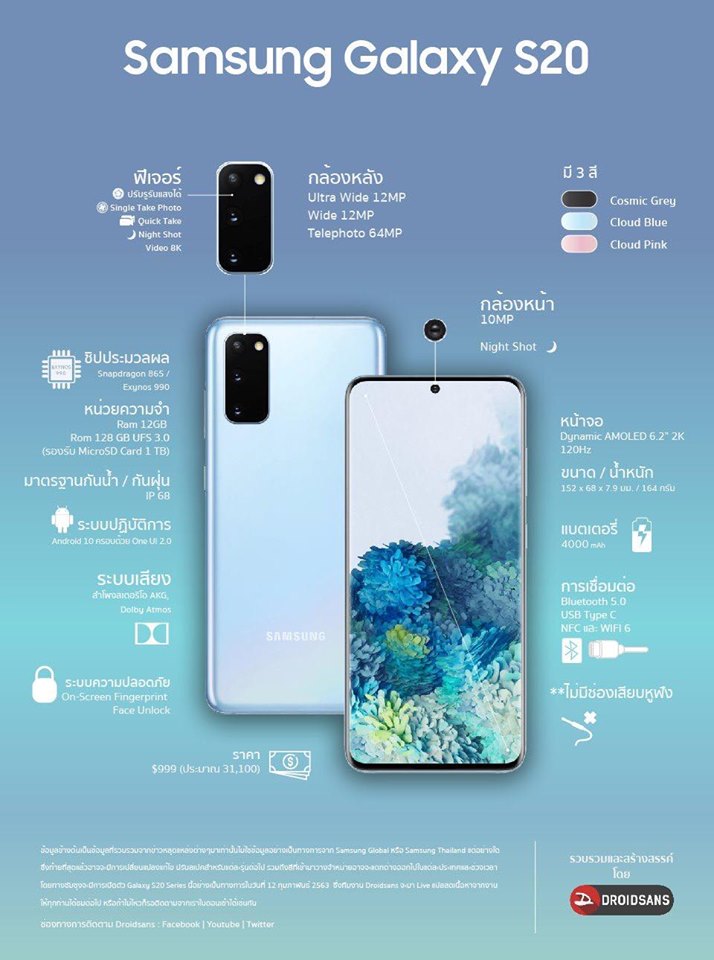 - Galaxy S20 : ราคาเริ่มต้น 999 ดอลลาร์ ประมาณ 31,100 บาท
