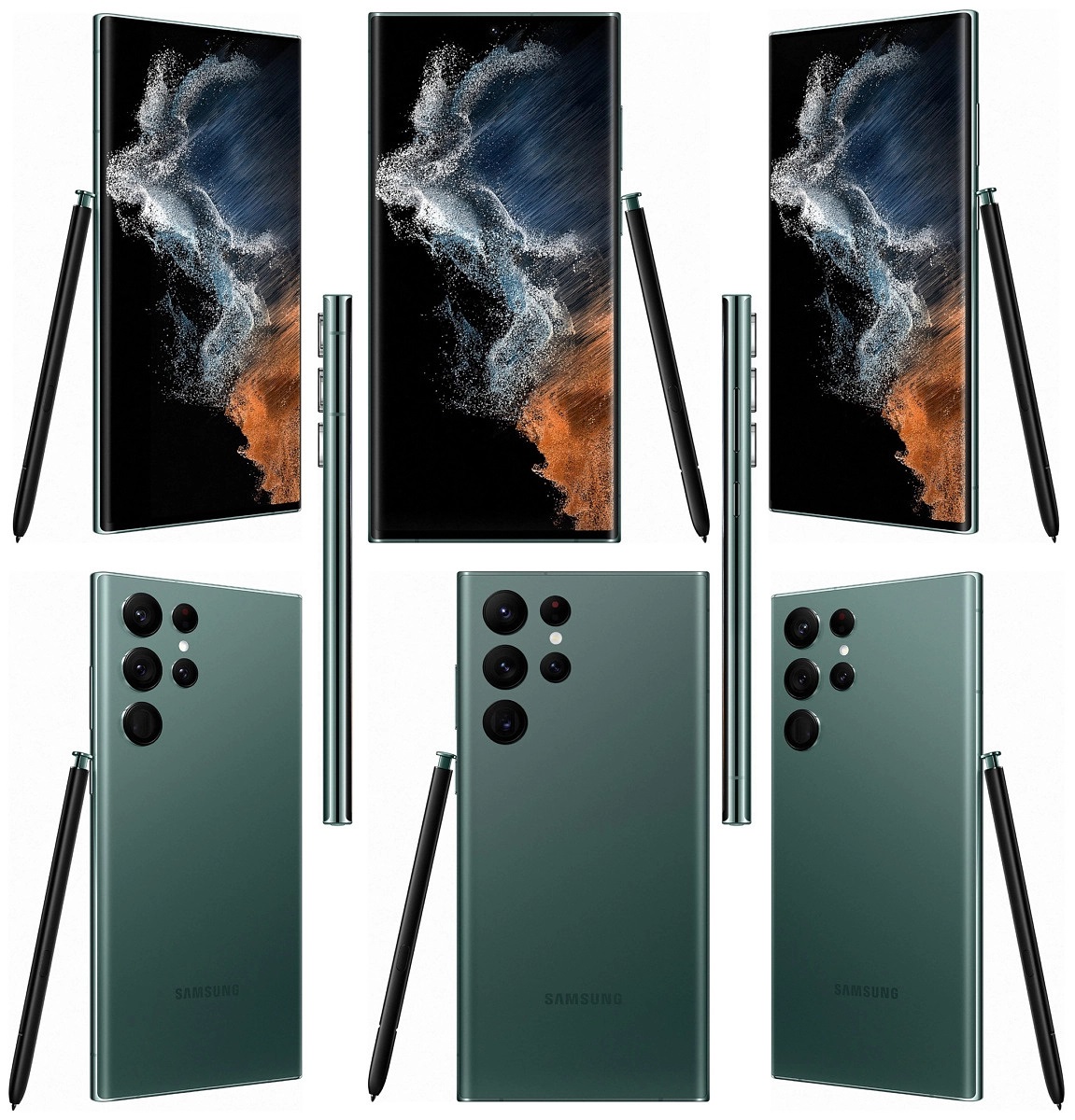 รุ่นพี่ใหญ่สุด Galaxy S22 Ultra ที่นอกจากจะมีดีไซน์ผิดแปลกไปจากรุ่นน้องแล้ว (เพราะดูไปแล้วจะเหมือนกับซีรีส์ Galaxy Note มากกว่า) ตัวเครื่องยังมีสีสันที่ดูขรึมและเป็นทางการกว่า ทั้งสีดำ, สีแดงเข้ม (หรือสีม่วง?), สีเขียวเข้ม และสีขาว ส่วนปากกา S Pen ที่ด้ามจะเป็นสีดำหมด ยกเว้นตรงตูดปากกาจะมีสีตามตัวเครื่อง