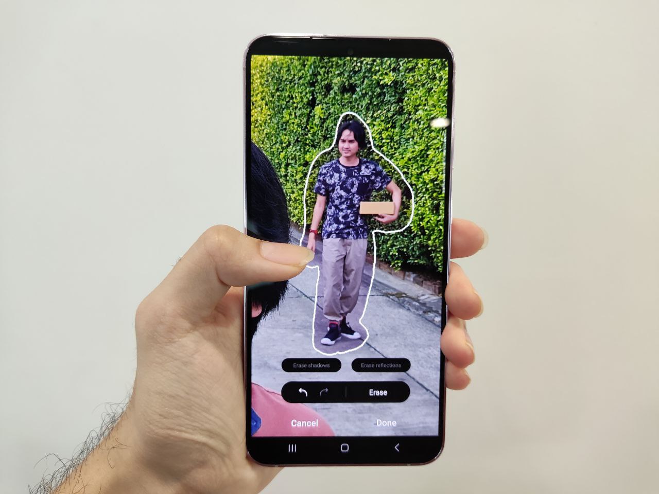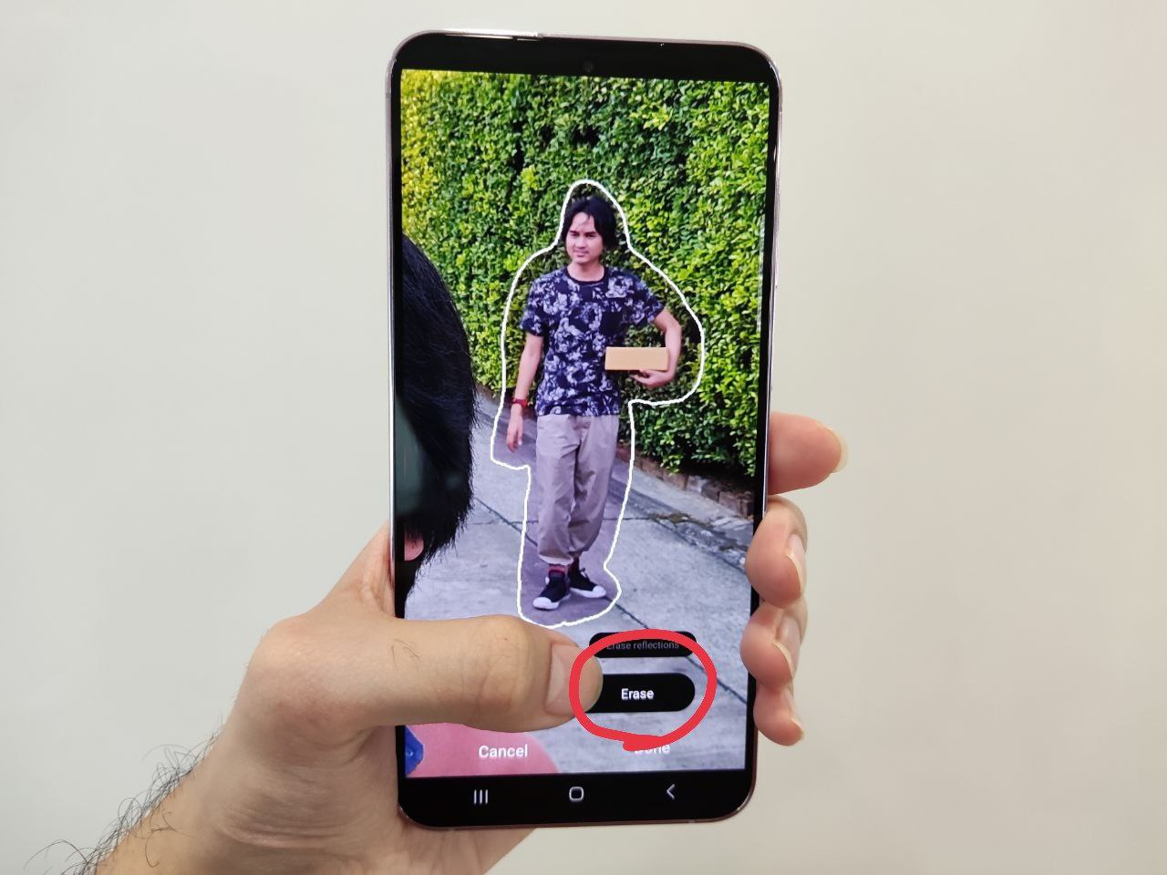 เมื่อเข้ามาในหน้าลบวัตถุ ก็ให้เอานิ้วคลุมส่วนที่ไม่ต้องการในภาพออก > เสร็จแล้วกด Erase ขวาล่าง