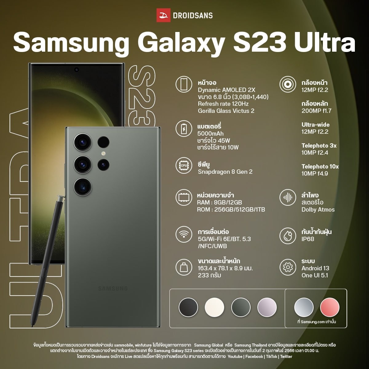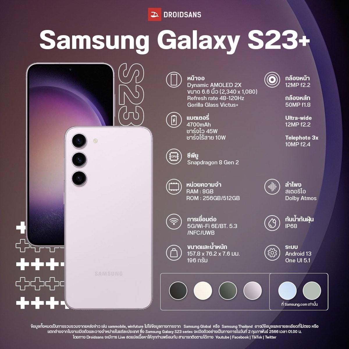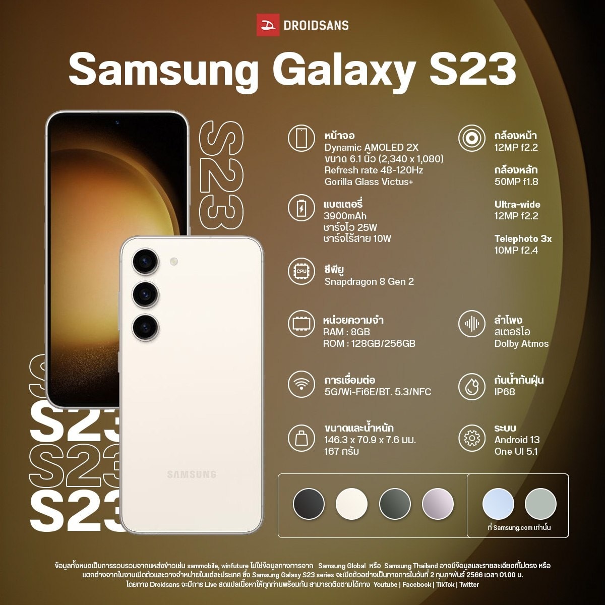 ตอนนี้ซัมซุงเปิดตัว Galaxy S23 แล้ว ใครสนใจสามารถเข้าไปดูรายละเอียดสเปคเครื่องจริง ได้ในเว็บไซต์ Samsung S23 I S23+ และสามารถเช็คราคาและโปรโมชั่นพิเศษได้เลยที่ Samsung S23 ราคาทางการ