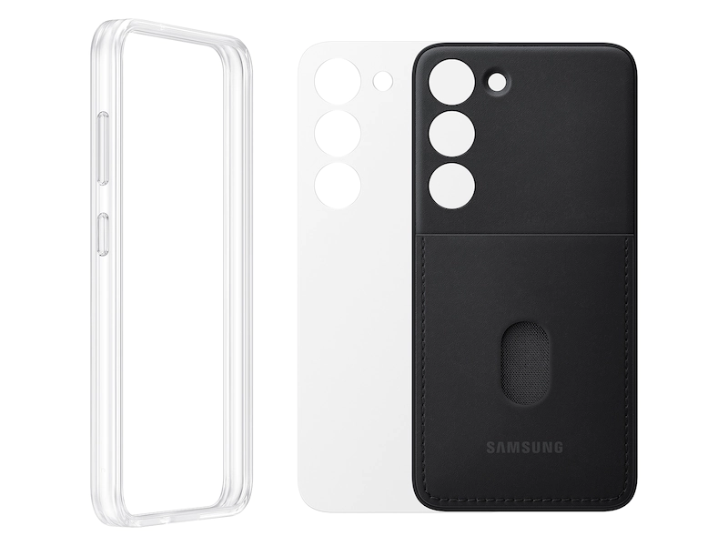 เคสเฟรมของ Samsung Galaxy S23, S23+, และ S23 Ultra จะมีด้วยกันทั้งหมด 3 ชิ้นให้ประกอบร่าง โดยแกนหลักของเคสจะอยู่ที่ตัวเฟรมที่เป็นกรอบหุ้มรอบ ๆ ตัวเครื่อง ส่วนฝาหลังของเคสถือเป็นทีเด็ด เพราะผู้ใช้งานสามารถเปลี่ยนด้านหลังได้ตามใจชอบ หากเบื่อก็สามารถซื้อฝาหลังลายต่าง ๆ มาเพื่อใช้เปลี่ยนได้ โดยฝาหลังที่มากับเคสชุดนี้จะมีด้วยกัน 2 อัน ได้แก่ ฝาหลังแบบใส และฝาหลังลายหนังพร้อมช่องใส่บัตร