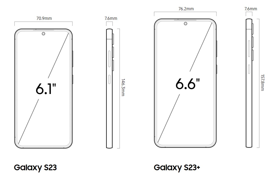 Galaxy S23 และ S23+ มาพร้อมกับจอ Dynamic AMOLED 2X ความละเอียด FHD+ 2340 x 1080 รีเฟรชเรต Adaptive ระหว่าง 48 – 120Hz รองรับ HDR10+ ให้ได้สีสันนุ่มลึก ต่างกันที่ขนาด Galaxy S23 จอกว้าง 6.1 นิ้ว Galaxy S23+ จอกว้าง 6.6 นิ้ว