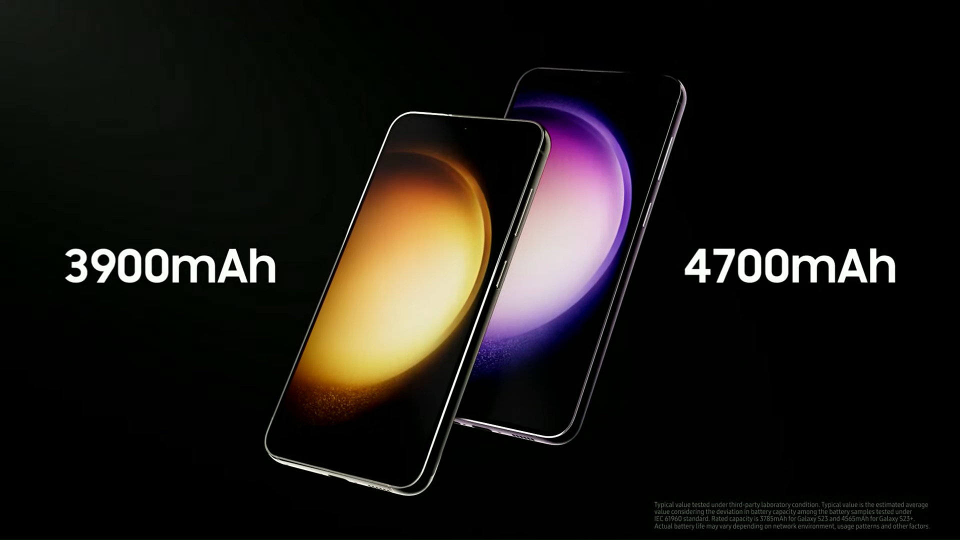 แม้ S23 Ultra จะยังได้ความจุแบต 5000 mAh แต่รุ่นน้อง ๆ ได้อัปเกรดขึ้นมา S23+ ความจุ 4700 mAh และ S23 แบตความจุ 3900 mAh ทำให้ใช้งานดูวิดีโอได้ยาวนาน 26, 27, และ 22 ชม. ตามลำดับ