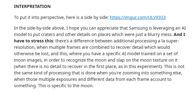 ทางผู้โพสต์ต้นเรื่อง เค้าก็ได้อ่านบทความอธิบายของระบบถ่ายดวงจันทร์ของซัมซุงแล้ว แต่ก็ยังยืนยันคำเดิมว่าเป็นการเฟคอยู่ดี โดยเค้าอธิบายว่า Samsung อ้างเรื่องการประมวลภาพหลายเฟรมนู่นนี่ แต่พอเอามาส่องดูภาพเบลอที่ทำขึ้นมาหลอกระบบแล้ว สุดท้ายก็ได้ภาพคมชัดสวยงามเกินความจริงอยู่ดี ดังนั้นตัวหลอกคือเอนจิ้นเพิ่มรายละเอียด (detail improvement engine) ที่ทำหน้าที่เกินเรื่องไปนั่นเอง