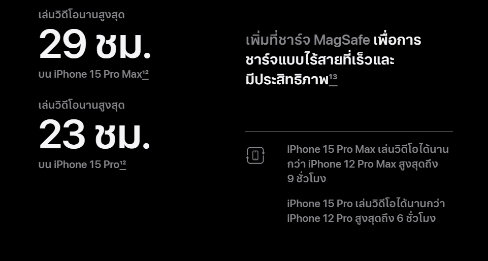แต่ในด้านการชารจ์ไร้สาย Galaxy S23 Ultra ยังคงเสมอกับ iPhone 15 Pro Max เพราะทั้ง 2 รุ่นสามารถชาร์จไร้สายได้สูงสุด 15W เท่ากัน แต่การชาร์จผ่านสาย Galaxy S23 ถือว่ายังนำอยู่ เพราะชาร์จได้ที่กำลังไฟสูงสุด 45W มากกว่า iPhone 15 Pro Max ไปแบบครึ่งต่อครึ่งเลยทีเดียว สำหรับการชาร์จ iPhone 15 Pro Max รองรับชาร์จไวจาก 0 – 50% ใช้เวลา 30 นาทีเมื่อใช้หัวชาร์จ 20W ซึ่งเทียบเท่ากับในรุ่นก่อนเช่นกัน