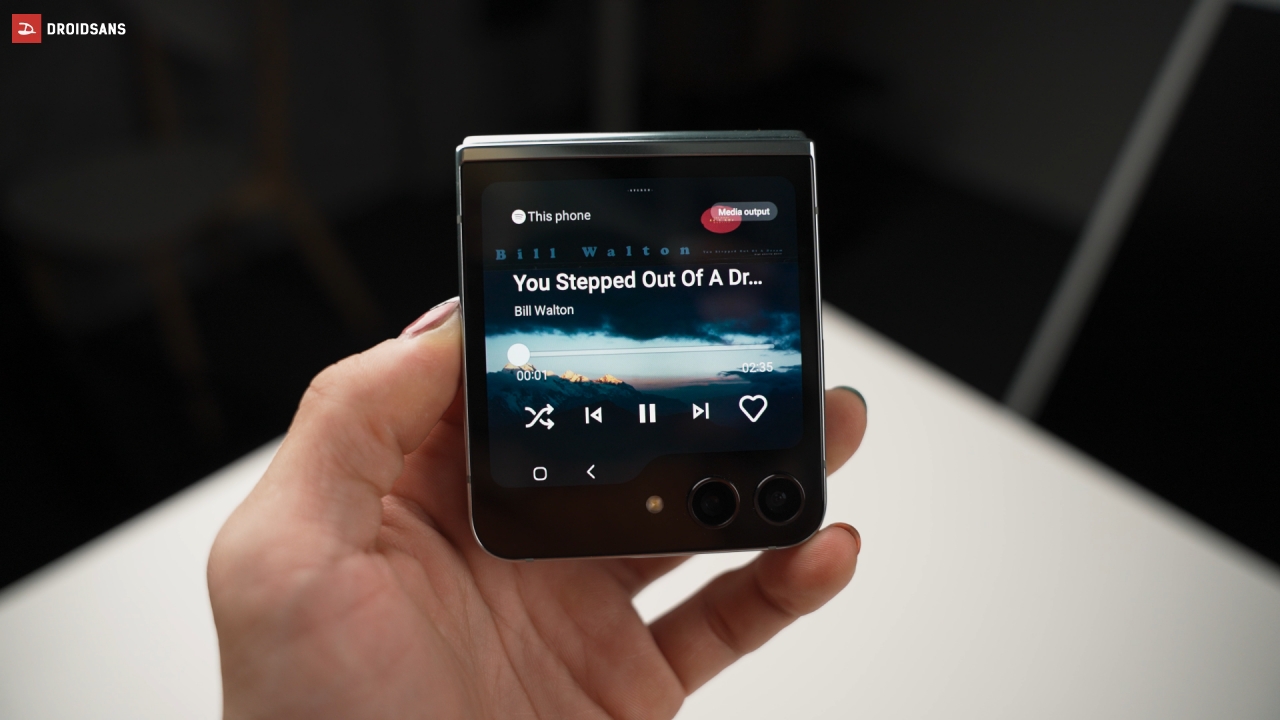 Galaxy Z Flip5 มาพร้อมกับ One UI 5.1.1 ที่ได้อัปเกรดหน้าตา Control Panel ใน Flex Mode ใหม่ให้สวยงามน่าใช้ โดยสีสันพื้นหลังจะเปลี่ยนตามวอลเปเปอร์ที่เราใช้งาน ไม่ได้ล็อกไว้ที่สีดำเหมือนรุ่นก่อน นอกจากนี้ยังมาพร้อมชุดปุ่มที่สามารถกดใช้คำสั่งต่าง ๆ ได้ง่ายขึ้น จะกดแคปจอ แบ่งหน้าจอ ย้ายหน้าต่าง หรือใช้จอล่างเป็น Touch Pad หรือจะเปลี่ยนเป็นเมนูควบคุมเพลงก็ได้ เรียกได้ว่าน่าใช้งานกว่าเดิมมาก ๆ