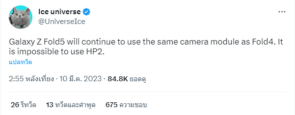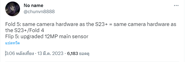 จอมหลุดเจ้าประจำทั้ง Ice Universe และ Chunvn8888 ได้ออกมาร่วมยืนยันว่า Samsung Galaxy Z Fold5 จะมาพร้อมกล้องหลังชุดเดิม ที่ประกอบไปด้วย กล้องหลัก 50MP มี OIS + Ultrawide 12MP + Telephoto 10MP รองรับ OIS และการซูมแบบ Optical 3 เท่า ซึ่งก็ไม่แน่ใจว่าเหตุใดถึงไม่ใช้กล้อง 200MP แบบ Galaxy S23 Ultra