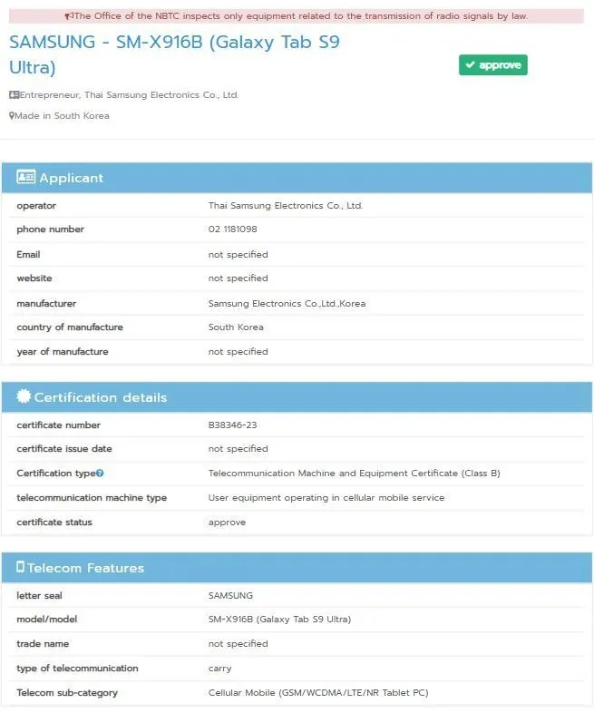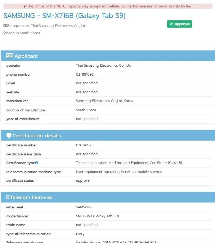 ส่วน Samsung Galaxy Tab S9 (SM-X716B) และ Galaxy Tab S9 Ultra (SM-X916B) ก็ผ่านการรับรองจาก กสทช. มาพร้อม ๆ กัน ตอนนี้เหลือเพียงรุ่น Galaxy Tab S9+ ยังคงเป็นปริศนาอยู่ คาดว่าคงจะตามมาในเร็ว ๆ นี้ สำหรับสเปคนั้น คาดว่าจะมาพร้อมกับจอแสดงผลแบบ Dynamic AMOLED X2 และใช้ชิป Snapdragon 8 Gen 2 เหมือนกันทุกรุ่น พร้อมรองรับมาตรฐานทนน้ำ ทนฝุ่นระดับ IP67 ยกซีรีส์เป็นครั้งแรก