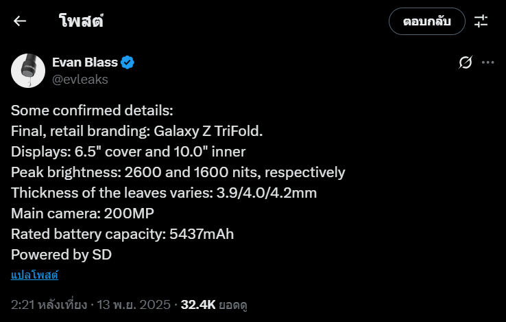 Leaker ชื่อดังอย่าง Evan Blass ได้ออกมาเปิดเผยว่า Samsung จะใช้ชื่อ Galaxy Z TriFold สำหรับมือถือจอพับสามทบรุ่นแรกของบริษัท และมาพร้อมสเปคที่น่าสนใจหลาย ๆ อย่าง เช่น ชิปประมวลผลของทาง Qualcomm อย่าง Snapdragon กล้องหลังความละเอียด 200MP และแบตเตอรี่ประมาณ 5,437mAh
