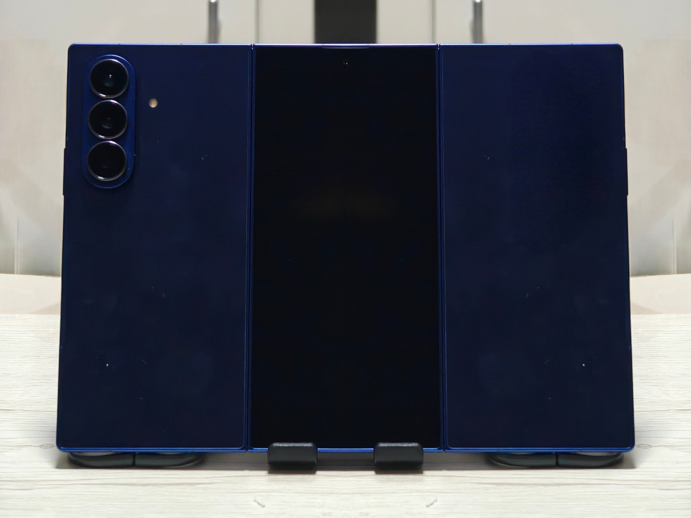 Galaxy Z TriFold (ชื่ออย่างไม่เป็นทางการ) ถูกจัดแสดงไว้ในตู้กระจกเพื่อให้ผู้เข้าชมสามารถเห็นดีไซน์หรือหน้าตาได้แบบชัดเจน โดยที่ยังไม่มีข้อมูลใดๆ ถูกปล่อยออกมาเพิ่มเติมในตอนนี้ โดยที่ตัวเครื่องจะมีบานพับแบบตัว G ตามที่เห็นดังรูปภาพ หากกางหน้าจอออกจนสุดจะเปลี่ยนร่างจากสมาร์ทโฟนเป็นแท็บเล็ตหน้าจอ 10 นิ้ว
