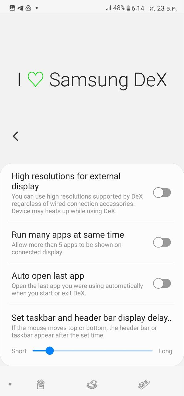 นอกจากนี้ยังมีเมนูปรับแต่ง Samsung Dex ให้เข้าไปปรับความละเอียดจอที่ต่อออกไป, เปิดแอปพร้อมกันเกิน 5 ตัว, เซฟหน้าแอปที่ใช้ไปก่อนหน้า, ตั้งค่าเวลาให้ Taskbar ขึ้นมาเวลาเอาเมาส์ไปชี้ด้วย