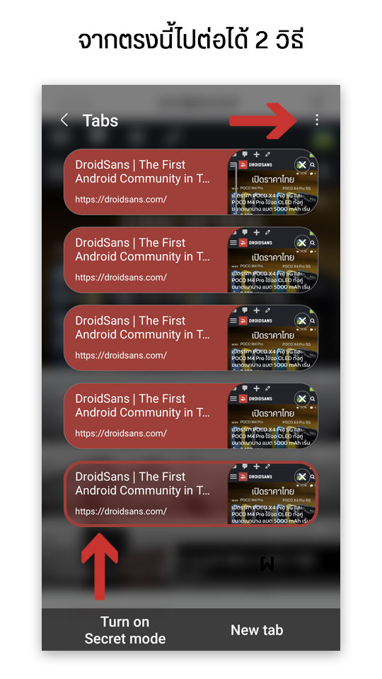 - วิธีที่ 1 คือ แตะปุ่มเมนูบริเวณมุมขวาบน
