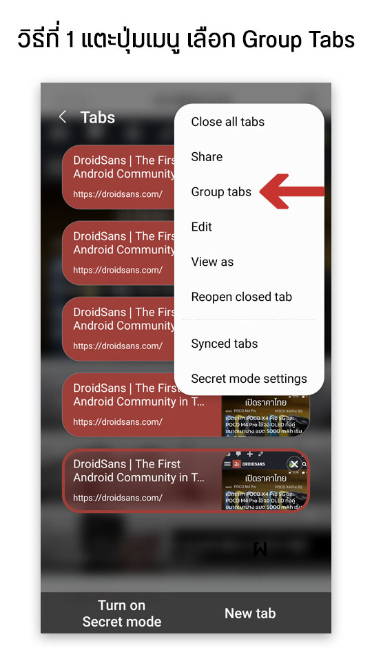 สำหรับวิธีการใช้งาน Tab group ใน Samsung Internet มีขั้นตอนง่าย ๆ ดังนี้