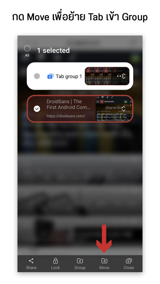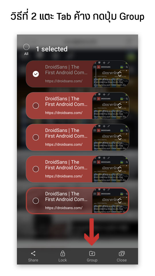 - วิทีที่ 2 คือ แตะ Tab ที่ต้องการจับกลุ่มค้างไว้ (อันไหนก็ได้)