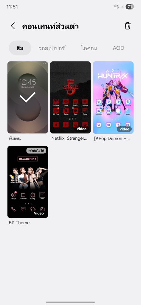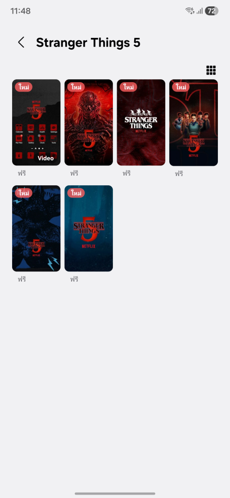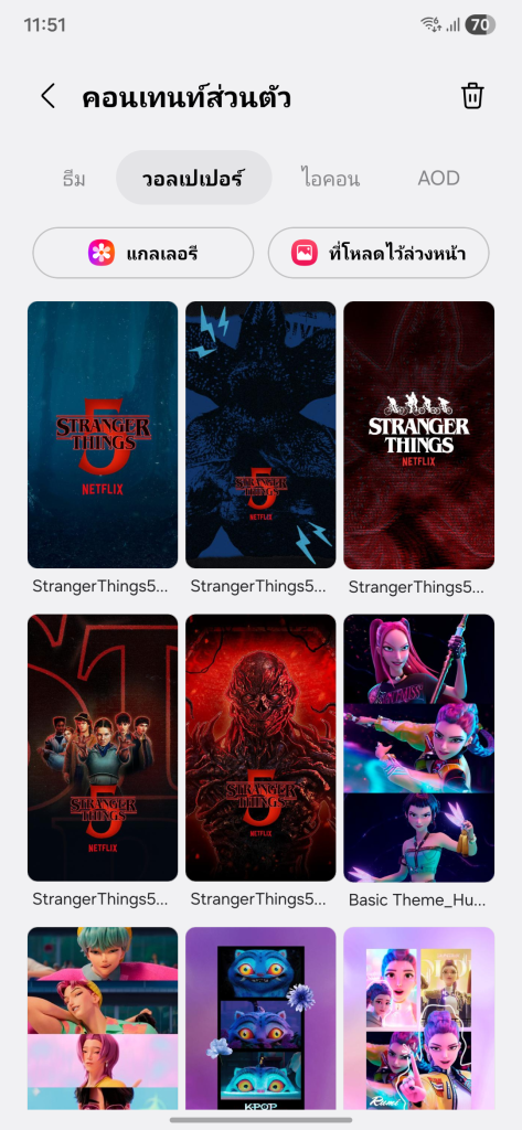เมื่อเข้ามาในหน้าคอนเทนท์ส่วนตัว หากการดาวน์โหลดเสร็จสิ้นจริง ๆ ระบบจะปรากฏธีมและวอลเปเปอร์ของ Stranger Things 5 มาให้เลือกใช้ได้ ซึ่งหากไม่มีขึ้นมาโชว์ให้ลองเช็คหน้าดาวน์โหลดของธีมนี้อีกครั้ง