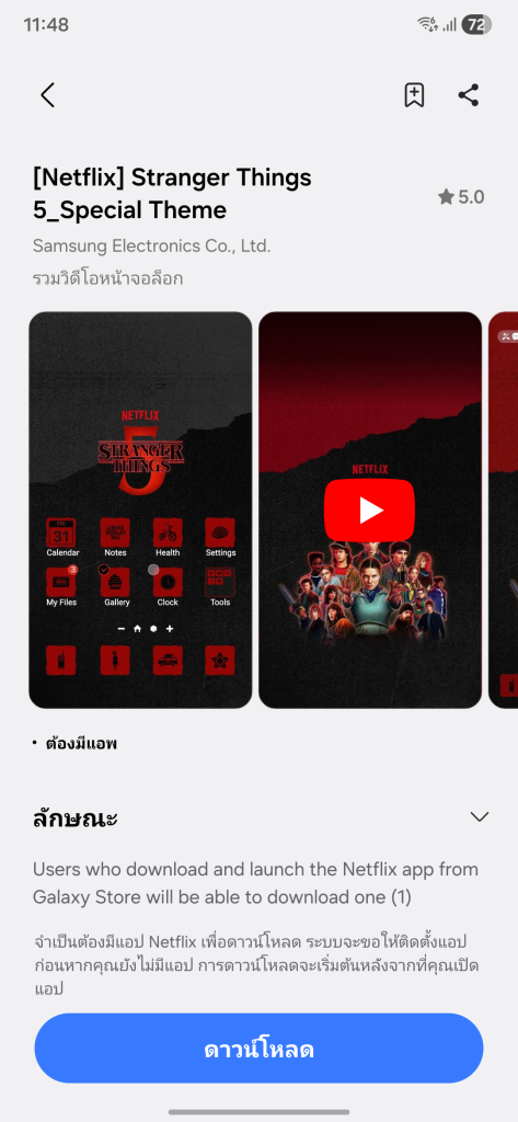 เมื่อกดบริเวณ Banner Stranger Things 5 แล้ว ให้กดตรงรูปพรีวิวธีมที่โชว์อีกครั้ง ระบบจะผ่านไปสู่หน้าดาวน์โหลดธีมดังกล่าว และกดที่ปุ่มดาวน์โหลด (สีฟ้า) บริเวณด้านล่างจอได้ทันที