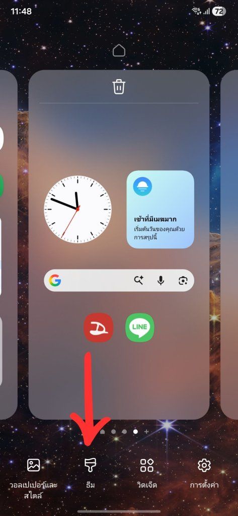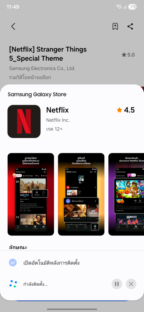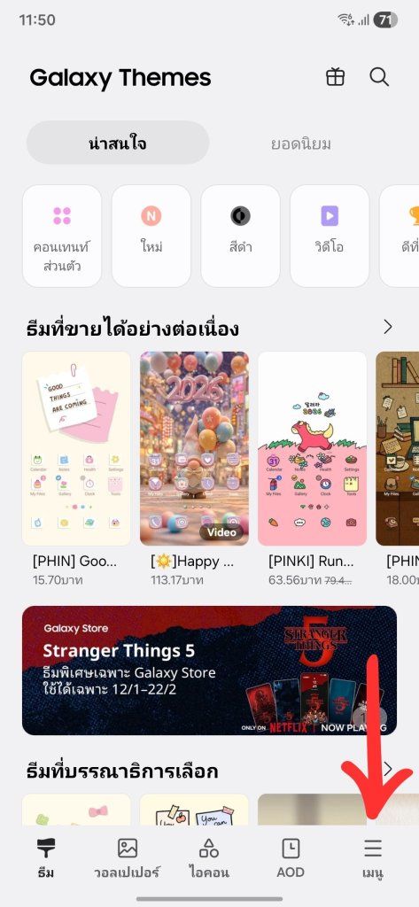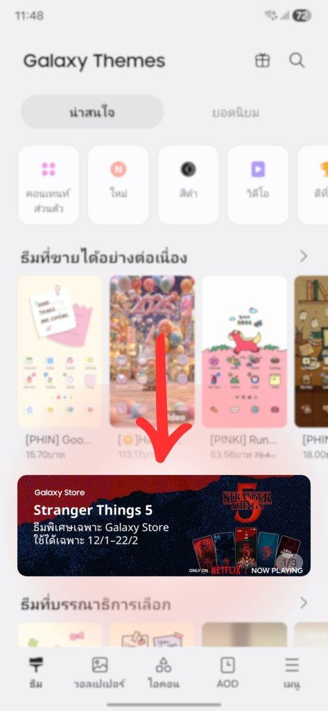 กดค้างบริเวณหน้าจอของมือถือและกดไปคำว่าธีม (Theme) ระบบจะพาไปที่หน้าร้านค้า Galaxy Themes เราจะพบชื่อ Stranger Things 5 เป็น Banner โชว์อยู่สามารถกดเข้าไปได้เลย