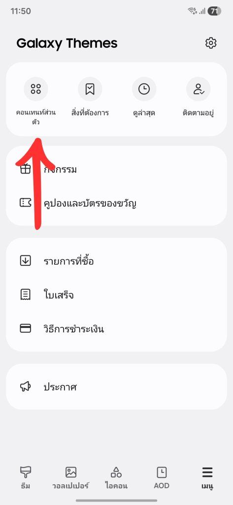 หากโหลดแล้วไม่รู้ว่าธีมและวอลเปเปอร์ที่ได้มาไปอยู่ที่ไหน ให้กดคำว่าธีมเหมือนขั้นตอนแรกเพื่อเข้าหน้า Galaxy Themes และกดคำว่า เมนู (Menu) ต่อด้วยคอนเทนท์ส่วนตัวได้เลย