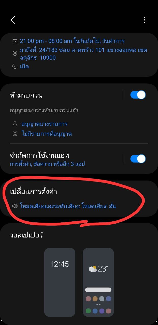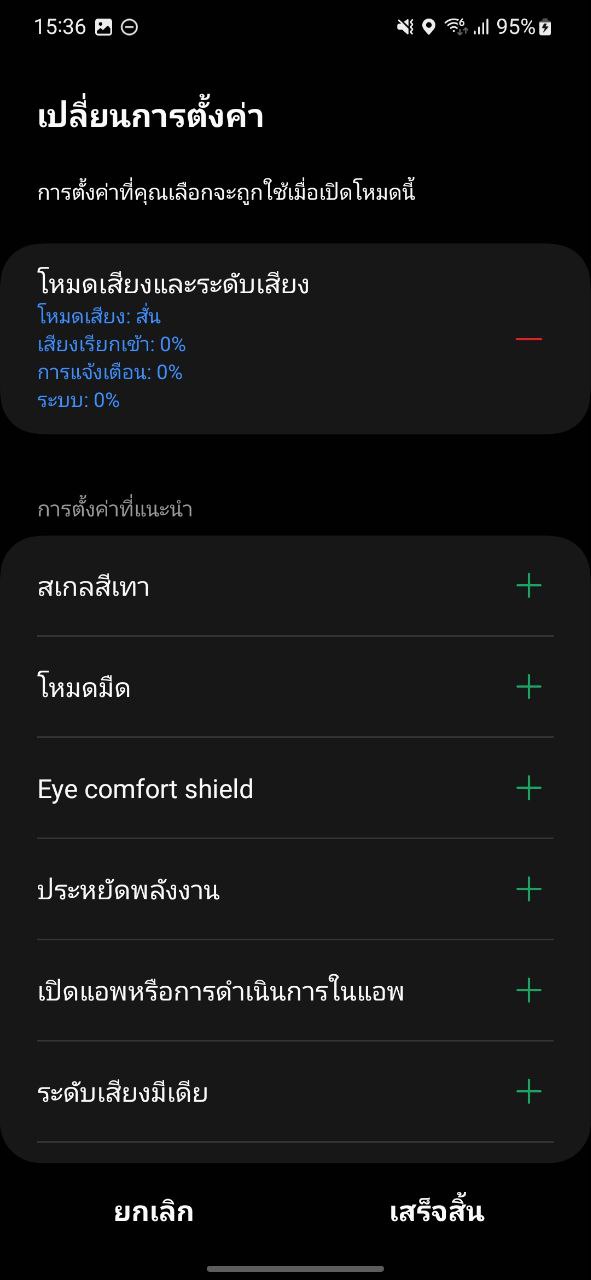 ถัดมา เปลี่ยนการตั้งค่า จะเป็นเมนูกำหนดแล้วว่าหลังเงื่อนไขถูกต้อง มือถือจะต้องทำอะไรบ้าง ก็เลือกการตั้งค่าที่ต้องการ เช่น เปิดใช้เกลสีเทา หรือเปิดโหมดถนอมสายตา สั่งใช้โหมดสั่น หรือไปกดปุ่มล่างสุด เพิ่มการดำเนินการ จะมีตัวเลือกให้เราปรับได้อีกเยอะมาก ๆ