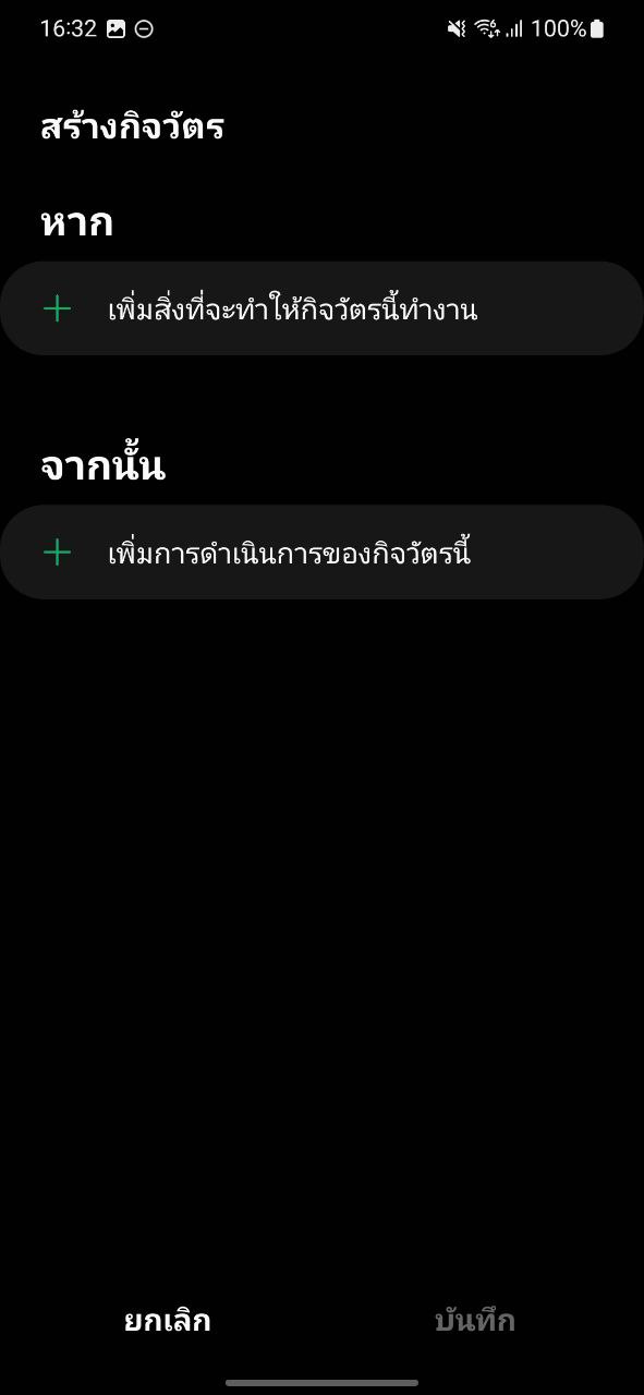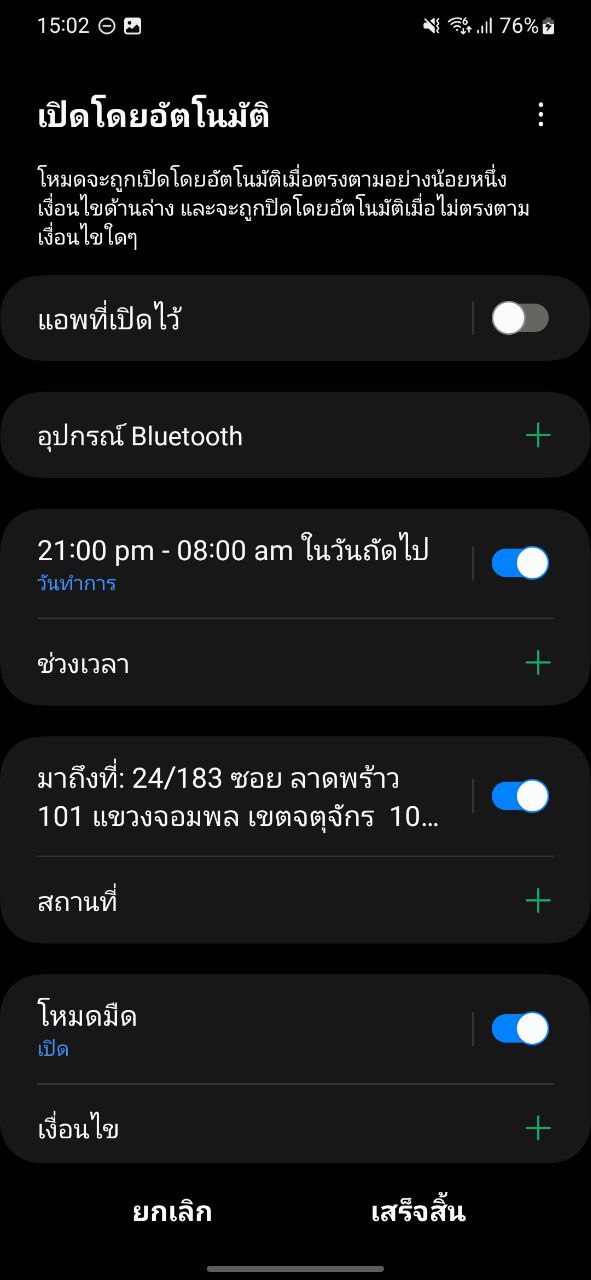 ตรงหัวข้อ หาก คือการตั้งค่าเงื่อนไข พอกดปุ่ม + เข้าไป ก็จะเจอตัวเลือกมากมาย ได้แก่ การเปิดใช้ Mode ถึงเวลาที่กำหนด สถานที่ การเชื่อมต่อสัญญาณ เชื่อมต่ออุปกรณ์ กิจกรรมที่ทำ การโทร และเงื่อนไขแอปนาฬิกา