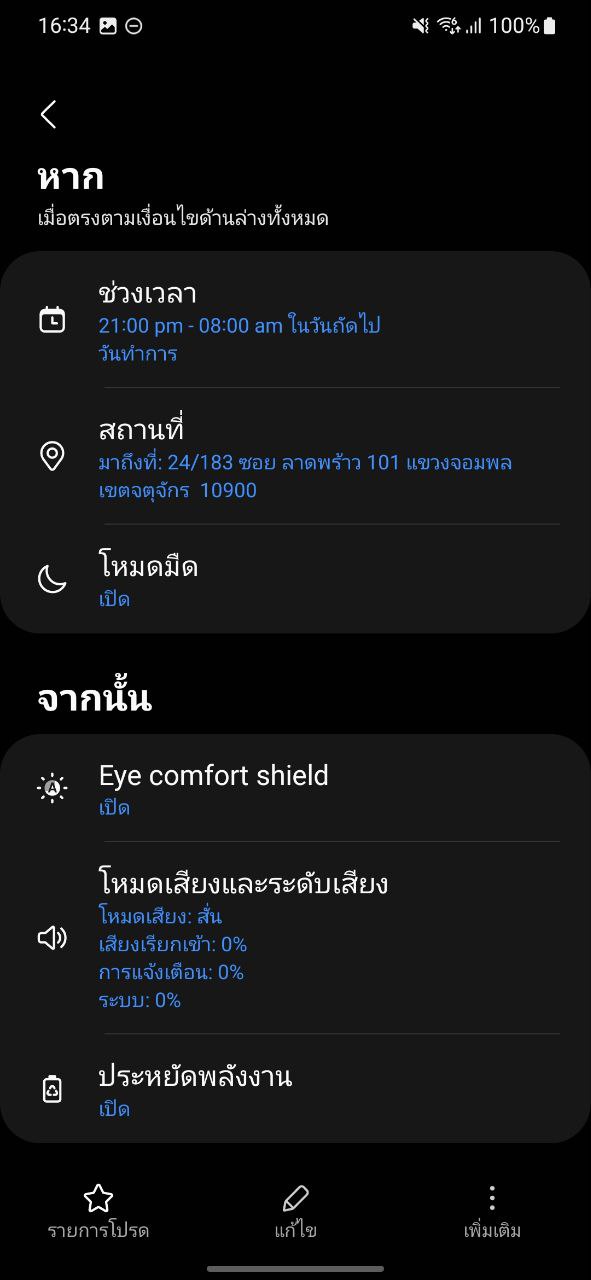 สมมติว่า เราต้องการให้มือถือปรับการตั้งค่าสำหรับการใช้งานช่วงก่อนนอน เวลาอยู่ที่บ้าน ก็ให้ตั้งเวลาตอนกลางคืน ตั้งสถานที่บ้านของเรา และเมนูสุดท้ายถ้าอยากเพิ่มเงื่อนไข ก็เพิ่มได้ เช่น จำกัดว่ามือถือต้อเปิดใช้โหมดมืดอยู่ ไม่งั้นก็ไม่ต้องเปิดใช้งาน