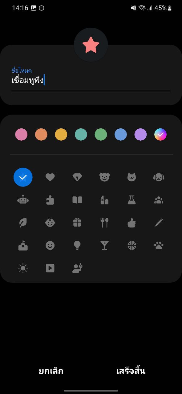 เข้ามาในหน้าแรกจะเป็นการตั้งชื่อโหมด เลือกไอคอน และสีสันที่ต้องการ พอใจแล้วก็กด เสร็จสิ้น