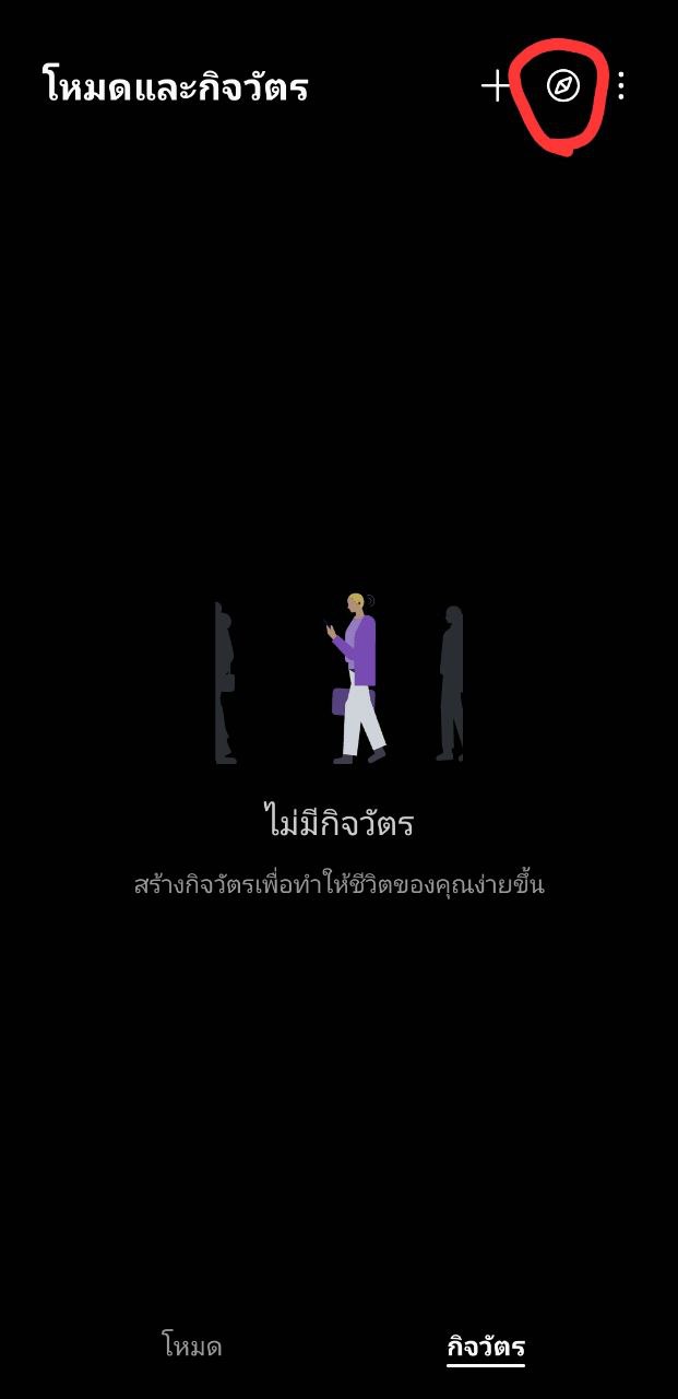 สลับไปอีกหน้าเป็น กิจวัตร จะเห็นจอโล่ง ๆ ไม่มีอะไรมาให้ หากต้องการเรียกใช้กิจวัตรที่เค้าแนะนำมาให้ ก็กดปุ่มเข็มทิศด้านขวาบน จะมีตัวเลือกหลายแบบให้ลองใช้