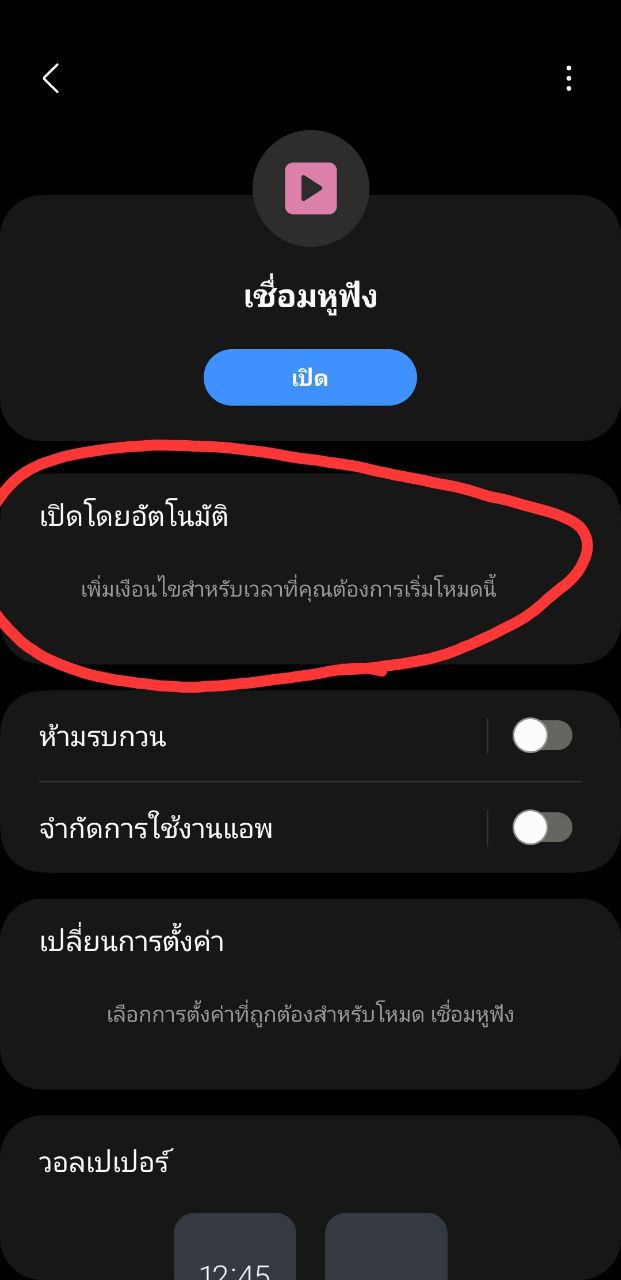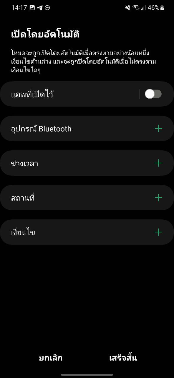 หน้าถัดมาจะประกอบไปด้วยหลายส่วน ด้านบนสุด เปิดอัตโนมัติ จะเป็นแถบให้เราใส่เงื่อนไขในการเปิดใช้งานโหมด กดเข้ามาก็จะมีตัวเลือก 5 อย่าง ได้แก่ แอปที่เปิดไว้ การเชื่อมอุปกรณ์ Bluetooth ช่วงเวลา สถานที่ เงื่อนไข