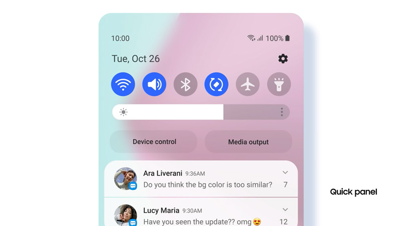 - จัดการเรียงลำดับของ Quick Panel ใหม่เล็กน้อย ย้ายปุ่ม Device และ Media output ขึ้นมาอยู่ตรงกลาง แล้วย้ายแถบปรับระดับระดับความสว่างหน้าจอลงมาด้านล่างแทน (สลับกัน) พร้อมทั้งออกแบบใหม่ให้มีขนาดใหญ่ขึ้น สอดคล้องเป็นดีไซน์เดียวกับแถบปรับระดับเสียง