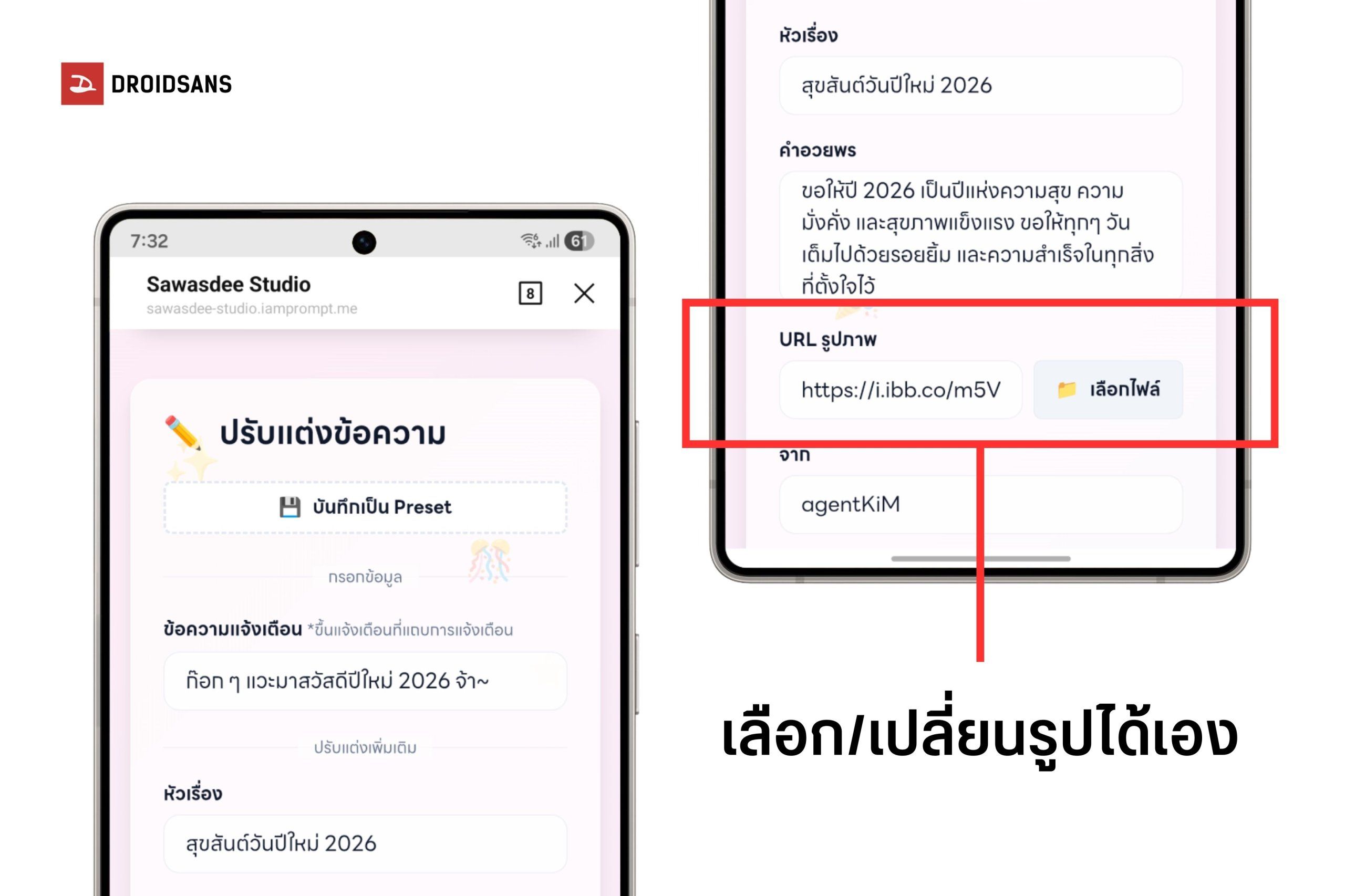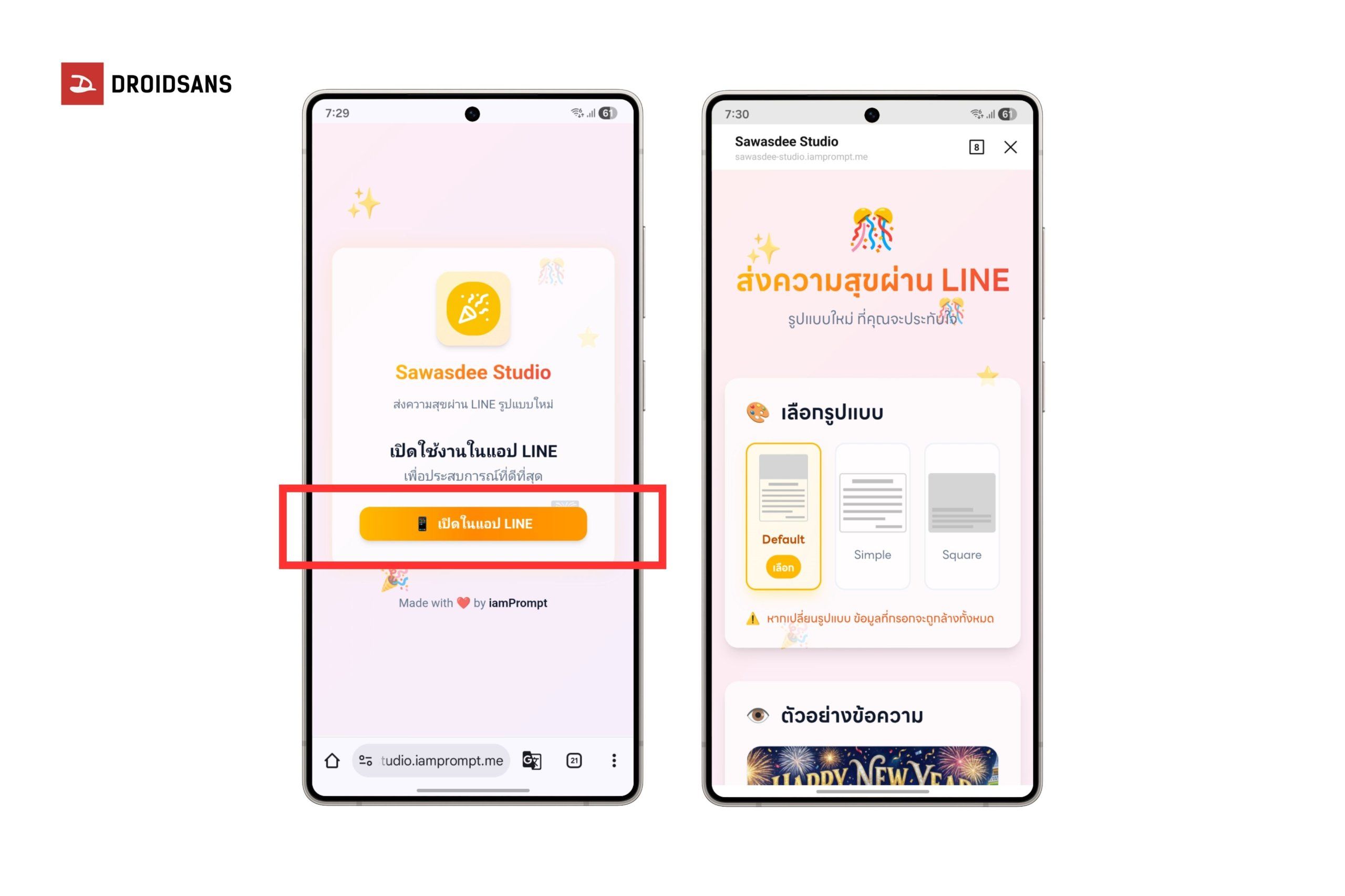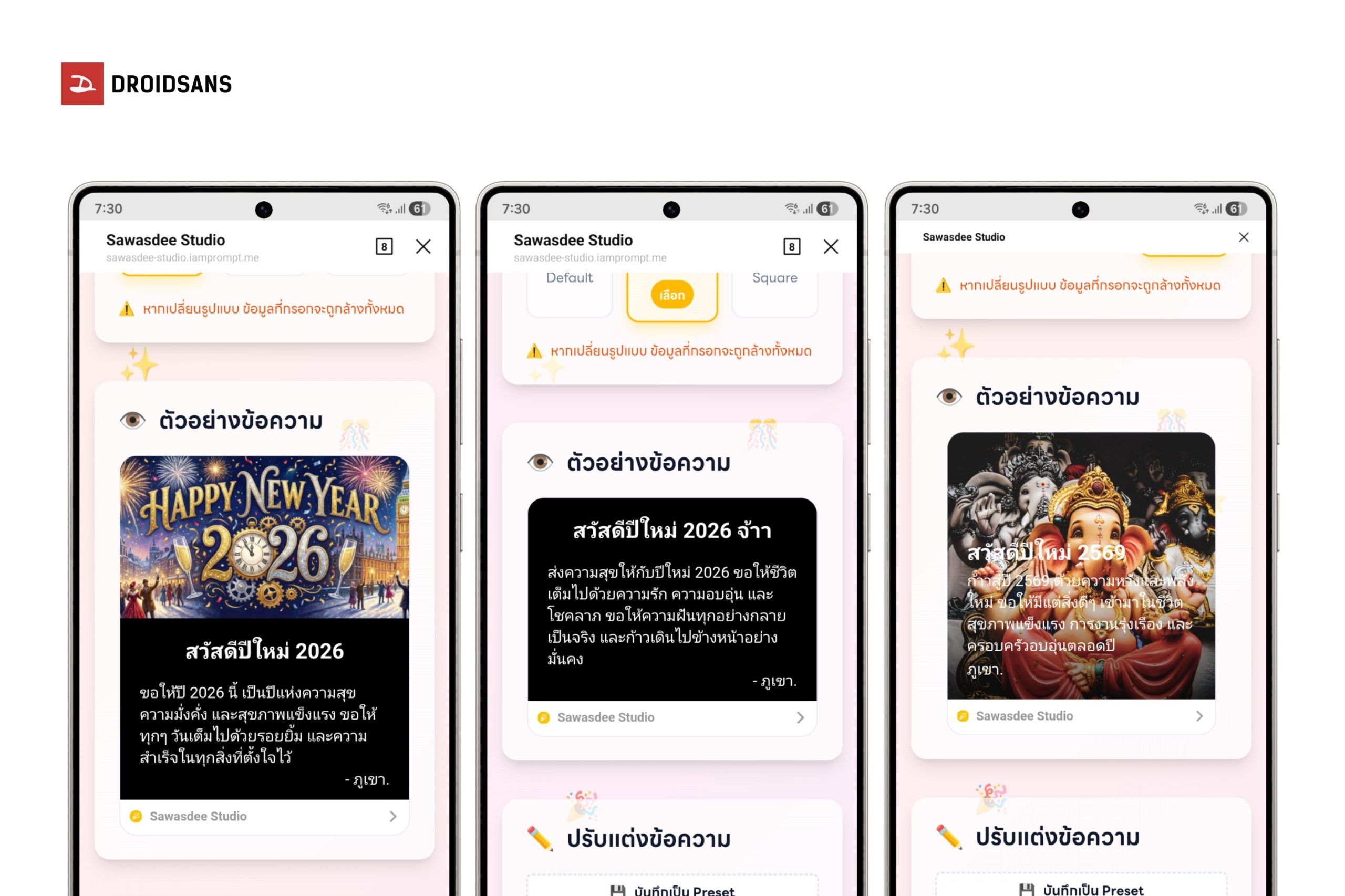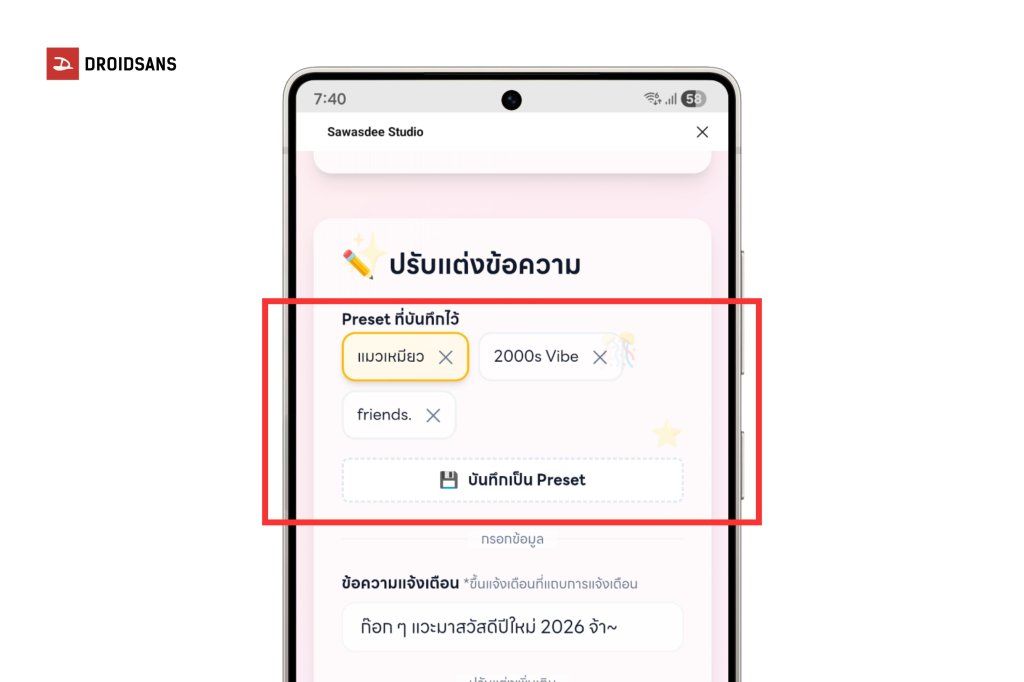 Sawasdee Studio ออกอัปเดตเวอร์ชันปี 2026 ให้ผู้ใช้งานสามารถทำ ส.ค.ส หรือส่งข้อความอวยพรปีใหม่กับเพื่อน ๆ ครอบครัว และคนที่รักบน LINE ได้ง่าย ๆ ไม่ต้องพิมพ์ข้อความใหม่บ่อย ๆ กดส่งได้ทันทีพร้อมกันหลายแชท DroidSans สรุปวิธีทำมาให้แล้ว !