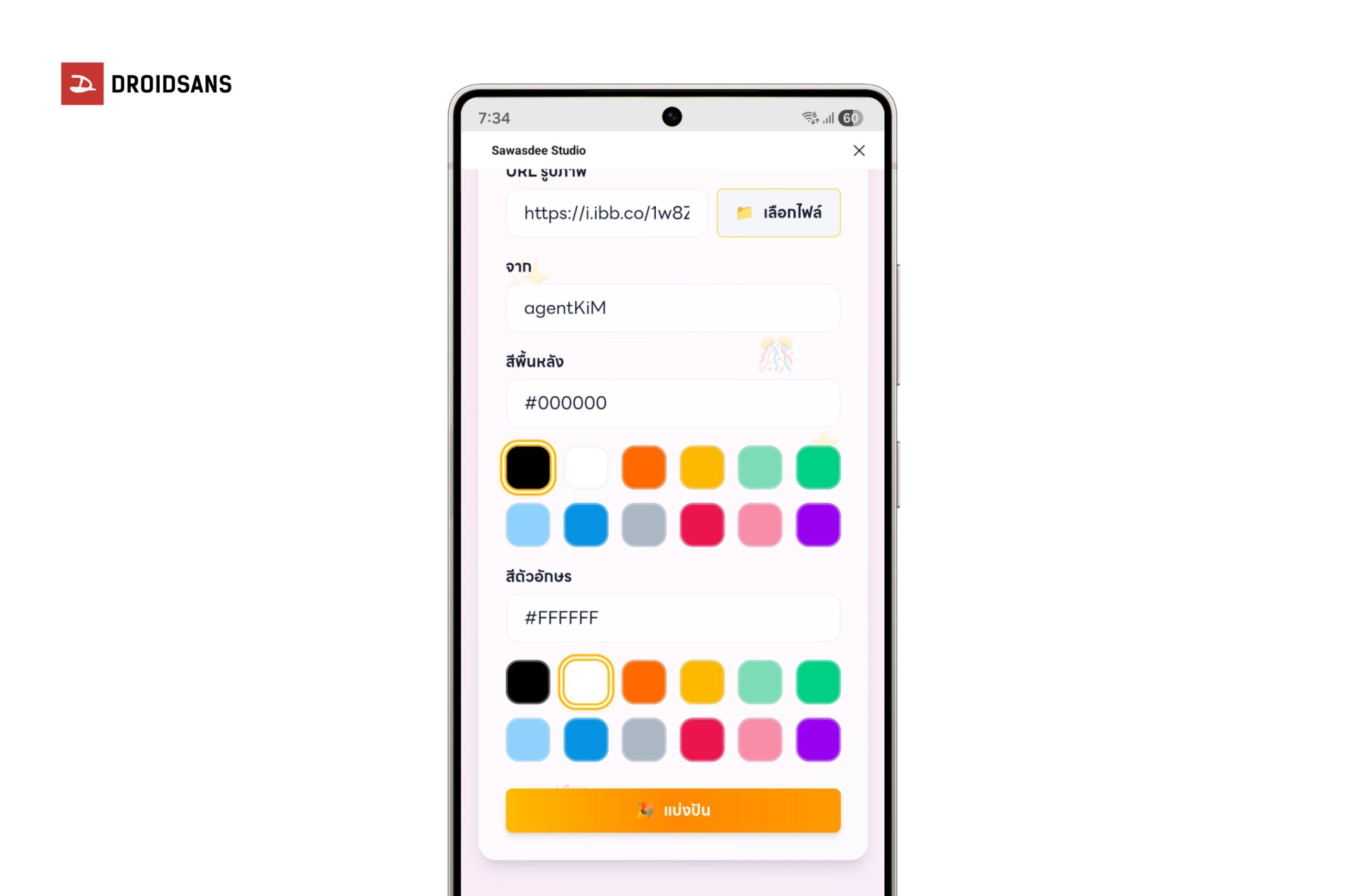 - สีพื้นหลัง และสีตัวอักษร – อันนี้ในกรณีที่เราต้องการปรับแต่งเพิ่มเติมว่าอยากให้สีของข้อความ หรือสีพื้นหลังสำหรับวางข้อความเป็นสีอะไร จะจิ้มเลือก Preset ที่มีให้อยู่แล้วหรือใช้เป็นโค้ดสีก็ได้
