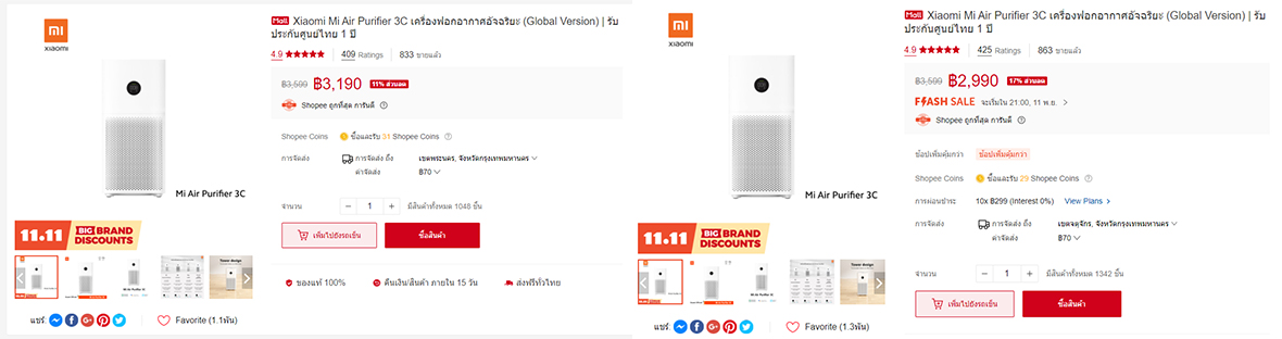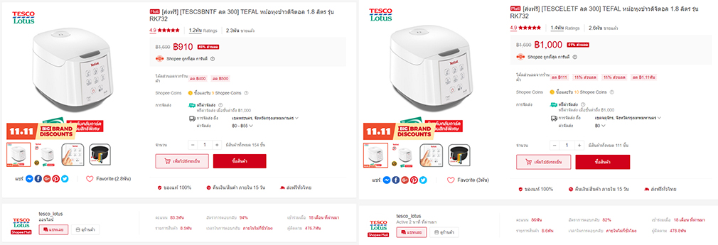 ส่วนของ Shopee ก็สามารถใช้วิธีเดียวกับ Lazada ได้เช่นกัน แต่ใช่ว่าทุกร้านจะลดราคาจริง สังเกตได้จากหม้อหุงข้าว Tefal ที่พอถึงวันที่ 11 เดือน 11 ราคาสูงกว่าปกติ 90 บาทเสียอย่างงั้น