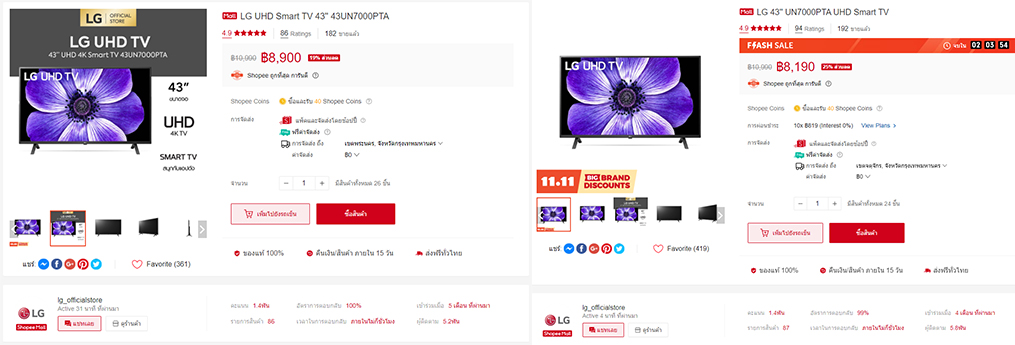 - ราคา LG UHD TV 43″ ของ Shopee วันที่ 11 เดือน 11 เป็นช่วงตอน Flash Sale พอดี