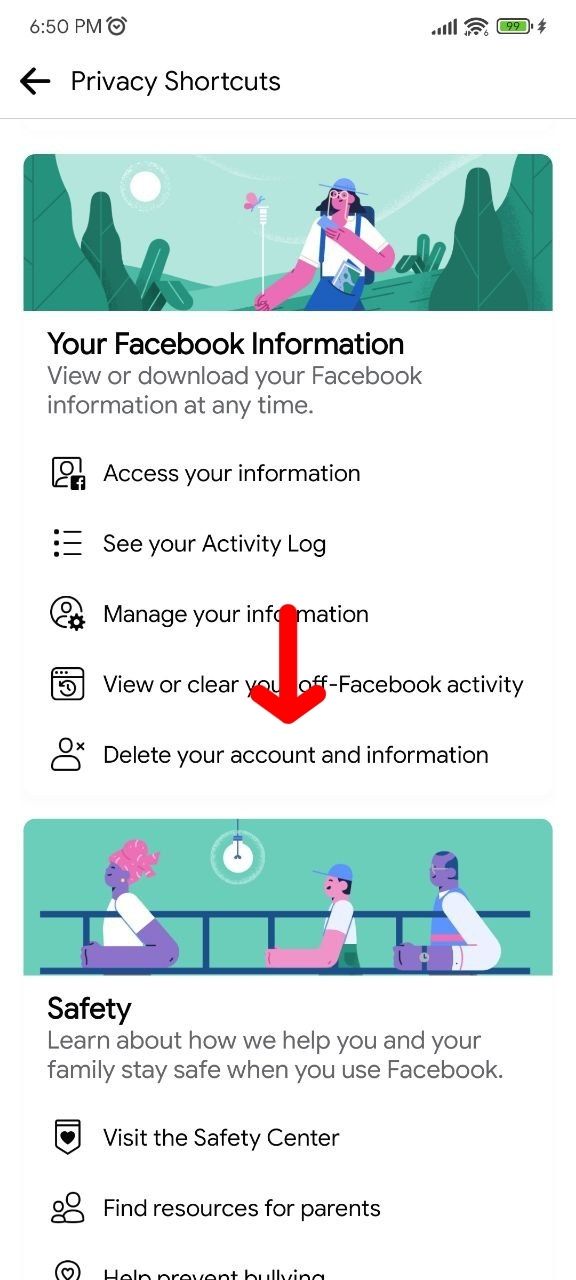 ตัวบัญชี Facebook นี่เลือกได้ว่าจะลบบัญชีชั่วคราว (Deactivate Account) หรือจะลบบัญชีถาวร (Delete Account) ซึ่งก็จะอยู่ในหน้าให้เลือกอันเดียวกัน เริ่มต้นได้โดยกดรูปโปรเราด้านขวาบน > เลื่อนลงล่างมากด Settings & Privacy > แล้วกด Privacy Shortcuts > จากนั้นลงมาที่แถบ Your Facebook Information แล้วกด Delete your account and information