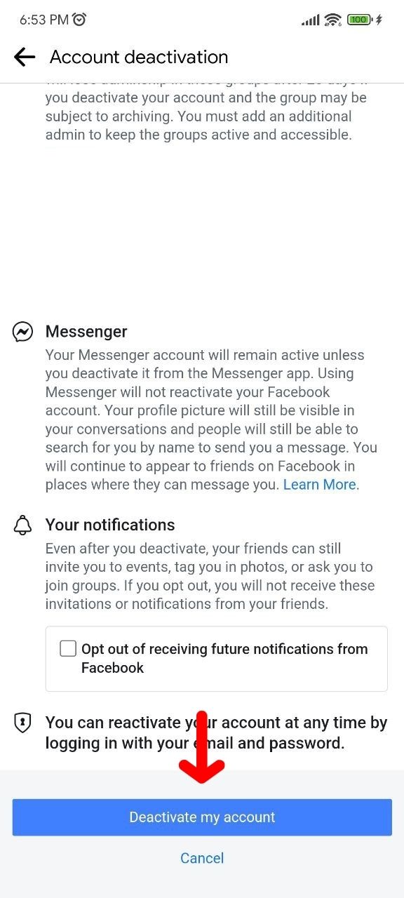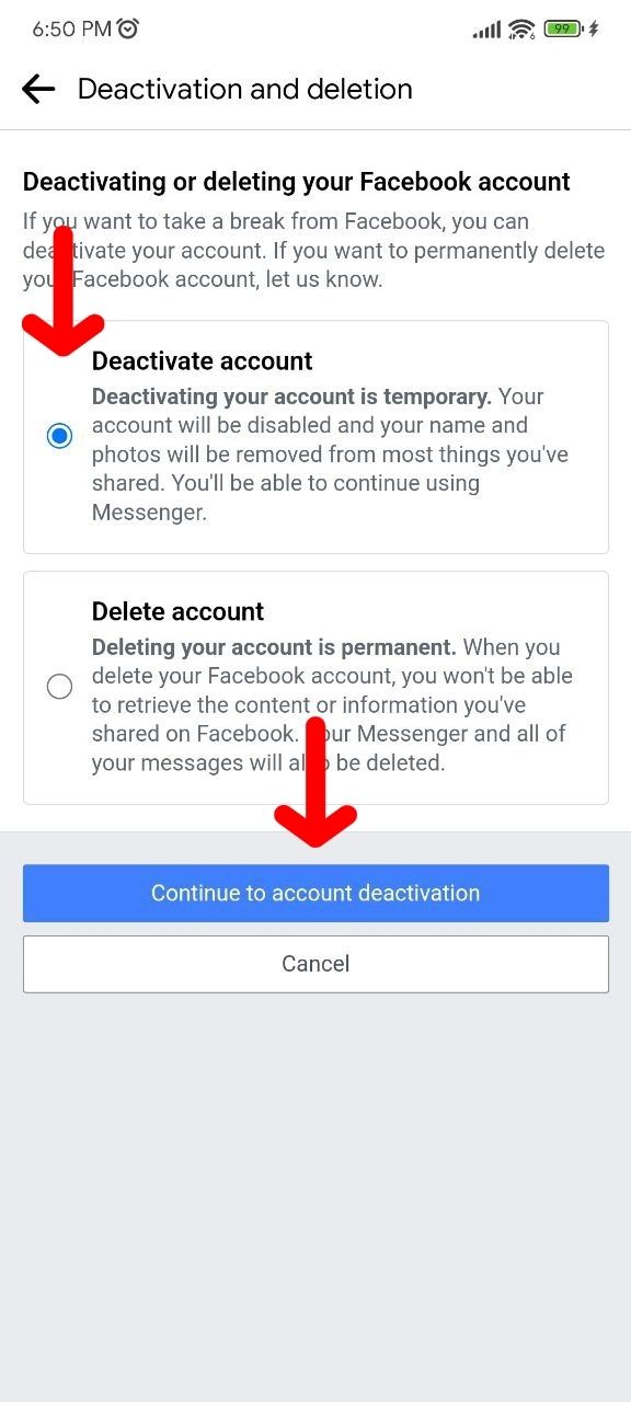 ถัดไปก็จะเป็นหน้ามีให้เลือกว่าจะกลับมาเปิดบัญชีภายในกี่วัน พอเลือกเสร็จกด Continue > จะพาไปหน้าสุดท้าย ที่ให้เรามีโอกาสดาสน์โหลดข้อมูล จัดการกลุ่มและเพจที่เคยสร้างไว้ ก่อนให้กด Deactivate my account เพียงเท่านี้ก็ถือว่าเราปิดบัญชีเฟซบุ๊กแบบชั่วคราวไปเรียบร้อยแล้วครับ