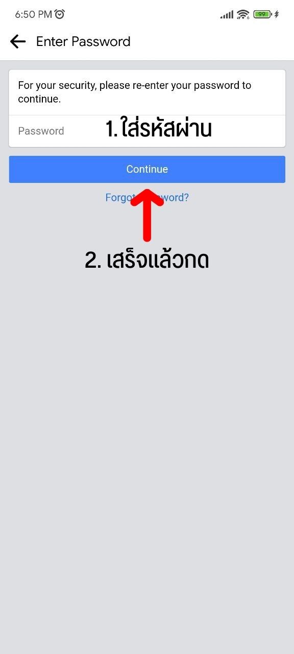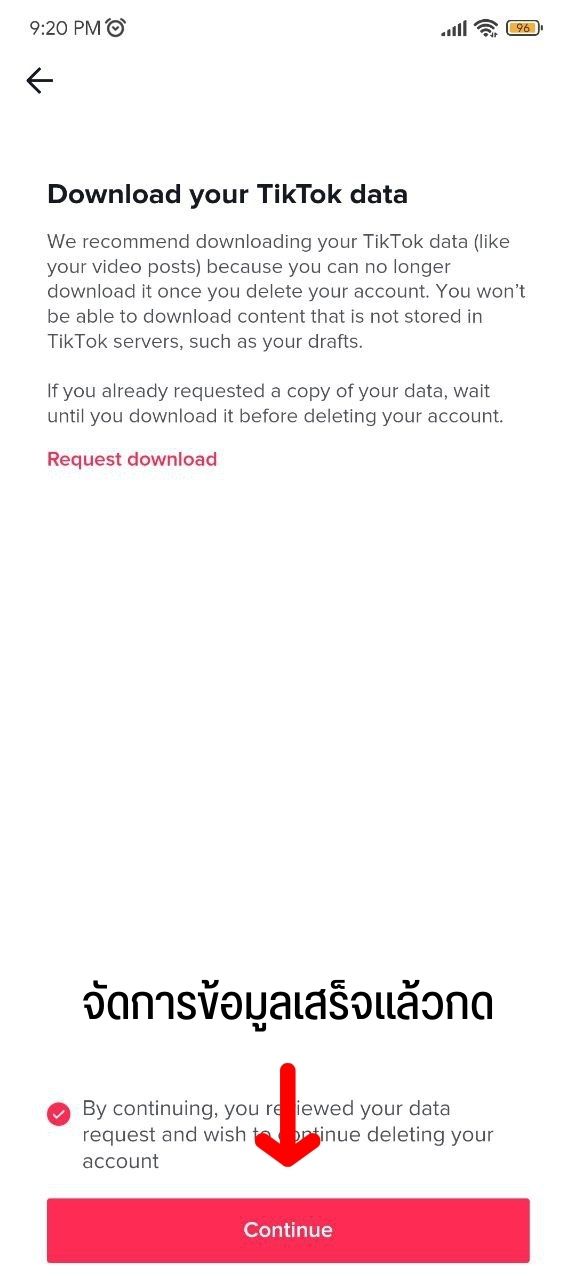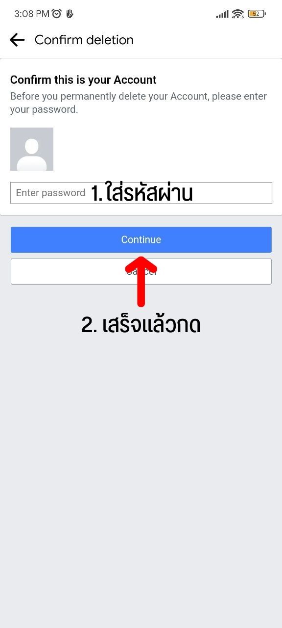 ถ้าจัดการข้อมูลเรียบร้อยแล้วก็กด continue ไปต่ออีกหน้า ก็จะมีข้อมูลเล่าให้เรารู้ว่าจะเกิดอะไรขึ้นบ้าง อ่านแล้วก็กด Continue > ก็จะถึงหน้าสุดท้ายให้ใส่รหัสผ่าน แล้วก็กด Delete account เป็นอันเสร็จเรียบร้อยครับ