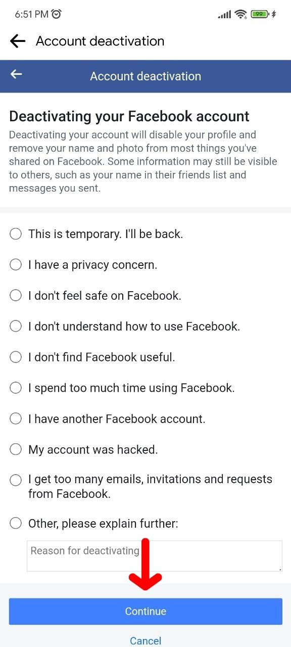 หากต้องการลบบัญชีแบบชั่วคราว ให้เลือก Deactivating Account ด้านบนแล้วกด Continue to account deactivation > ใส่รหัสผ่านของเรา แล้วกด Continue > มาหน้าใส่เหตุผลที่ต้องการลบบัญชีชั่วคราว จะเลือกหรือไม่เลือกก็ได้ เสร็จแล้วกด Continue