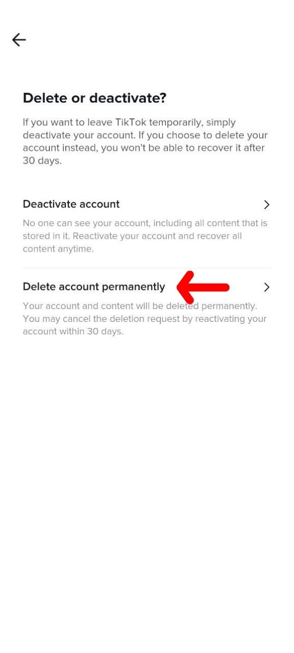 Tiktok มีตัวเลือกว่าจะลบบัญชีเพียงชั่วคราว (Deactivate Account) หรือลบบัญชีถาวร (Delete account permanently) ซึ่งเราไปที่หน้าเลือกได้โดยการกดไปที่หน้าบัญชีเราตรงปุ่มขวาล่าง > กดไอคอนสามแถวขวาบน > กด Setting and Privacy