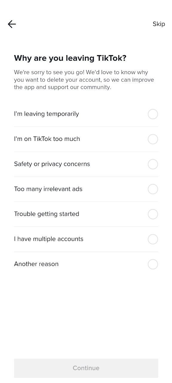 ถ้าคิดว่าจะไม่กลับมาเล่น Tiktok แล้วเด็ดขาด ก็มีทางเลือกให้กดลบบัญชีถาวรได้ ในหน้าเลือกรูปแบบการลบให้เลือก Delete account permanently > ก็จะมีหน้าถามสาเหตุว่าทำไมถึงลบ จะตอบหรือกดข้าม Skip ไปก็ได้ครับ